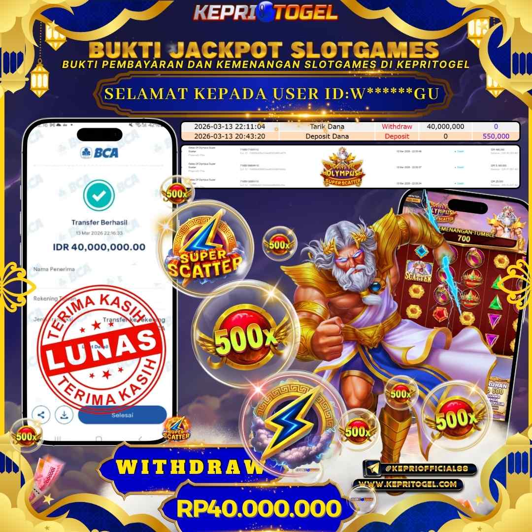 Selamat kepada UserId W******GU telah berhasil mendapatkan kemenangan jackpot pada permainan Slot Gates Of Olympus Super Scatter Kepritogel sebesar Rp40,000,000,- . Kepritogel situs terpercaya sejak dulu hingga saat ini , Untuk kemenangan berapapun pasti akan kami bayarkan . Jangan ragu bermain di Kepri Togel . Kami pihak Kepritogel Menyampaikan terima kasih kepada seluruh member Kepri Togel yang telah Percaya dan setia Bersama kami bermain di Kepritogel hingga saat ini.