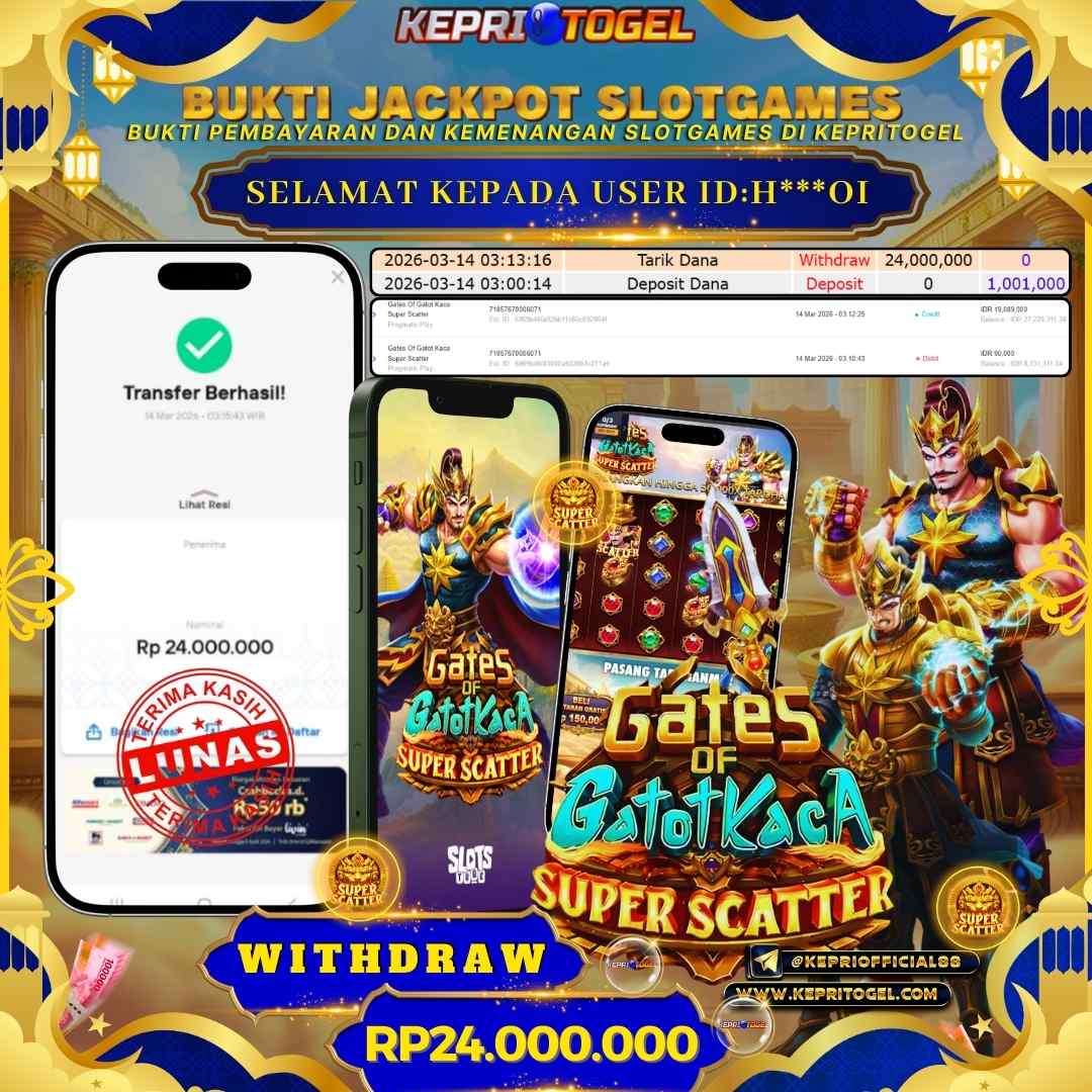 Selamat kepada UserId H***OI telah berhasil mendapatkan kemenangan jackpot pada permainan Slot Gates Of Gatot Kaca Super Scatter Kepritogel sebesar Rp24,000,000,- . Kepritogel situs terpercaya sejak dulu hingga saat ini , Untuk kemenangan berapapun pasti akan kami bayarkan . Jangan ragu bermain di Kepri Togel . Kami pihak Kepritogel Menyampaikan terima kasih kepada seluruh member Kepri Togel yang telah Percaya dan setia Bersama kami bermain di Kepritogel hingga saat ini.