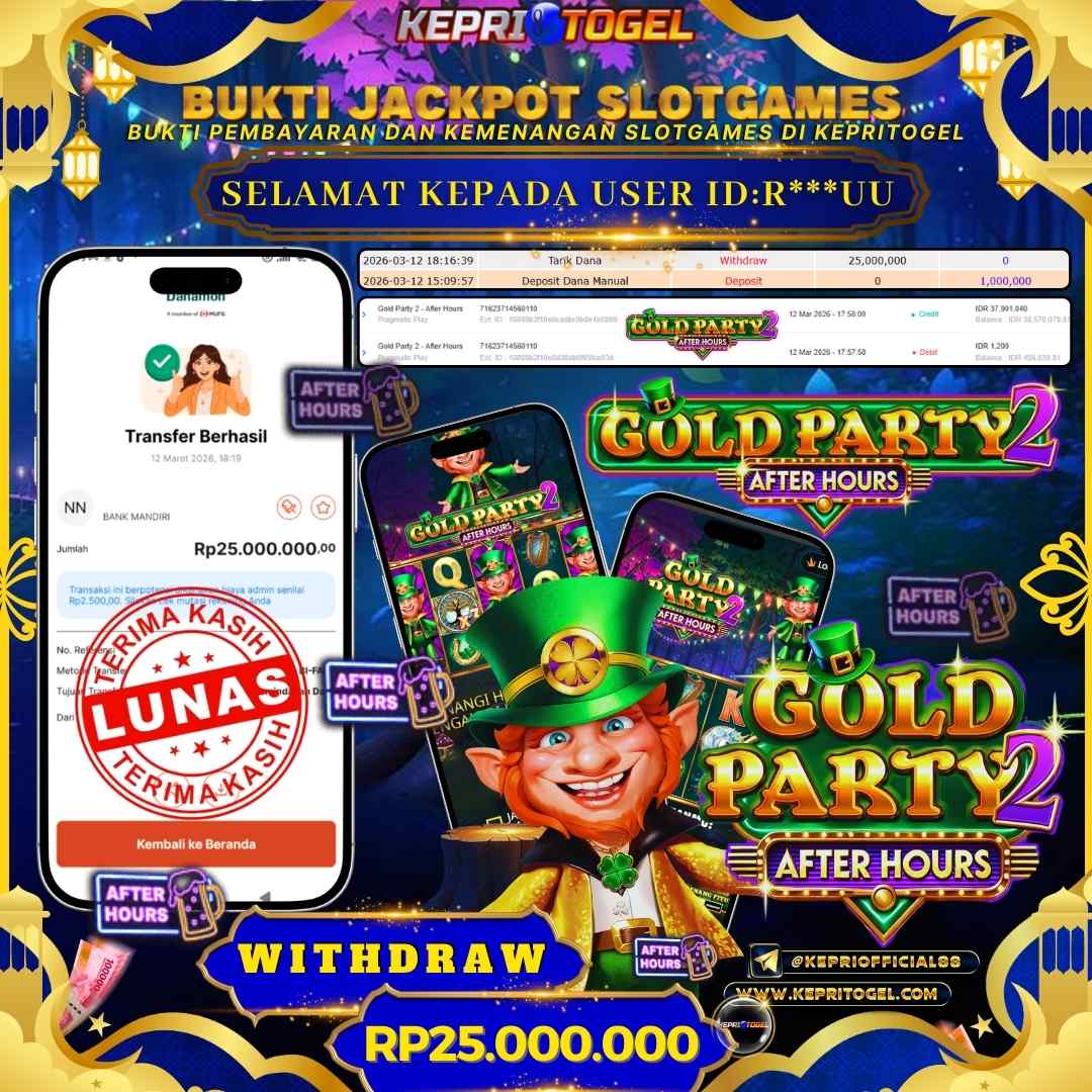 Selamat kepada UserId R***UU telah berhasil mendapatkan kemenangan jackpot pada permainan Slot Gold Party 2 - After Hours Kepritogel sebesar Rp25,000,000,- . Kepritogel situs terpercaya sejak dulu hingga saat ini , Untuk kemenangan berapapun pasti akan kami bayarkan . Jangan ragu bermain di Kepri Togel . Kami pihak Kepritogel Menyampaikan terima kasih kepada seluruh member Kepri Togel yang telah Percaya dan setia Bersama kami bermain di Kepritogel hingga saat ini.