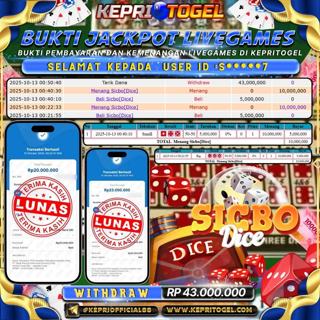 epritogel Jackpot Live Game Sicbo Dice Rp43,000,000
