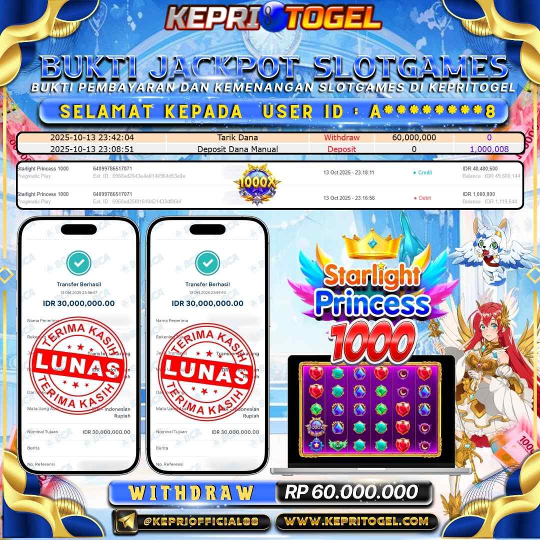 Selamat kepada UserId p****l telah berhasil mendapatkan kemenangan jackpot pada permainan Slot Starlight Princess 1000 Kepritogel sebesar Rp25,000,000,- . Kepritogel situs terpercaya sejak dulu hingga saat ini , Untuk kemenangan berapapun pasti akan kami bayarkan . Jangan ragu bermain di Kepri Togel . Kami pihak Kepritogel Menyampaikan terima kasih kepada seluruh member Kepri Togel yang telah Percaya dan setia Bersama kami bermain di Kepritogel hingga saat ini.