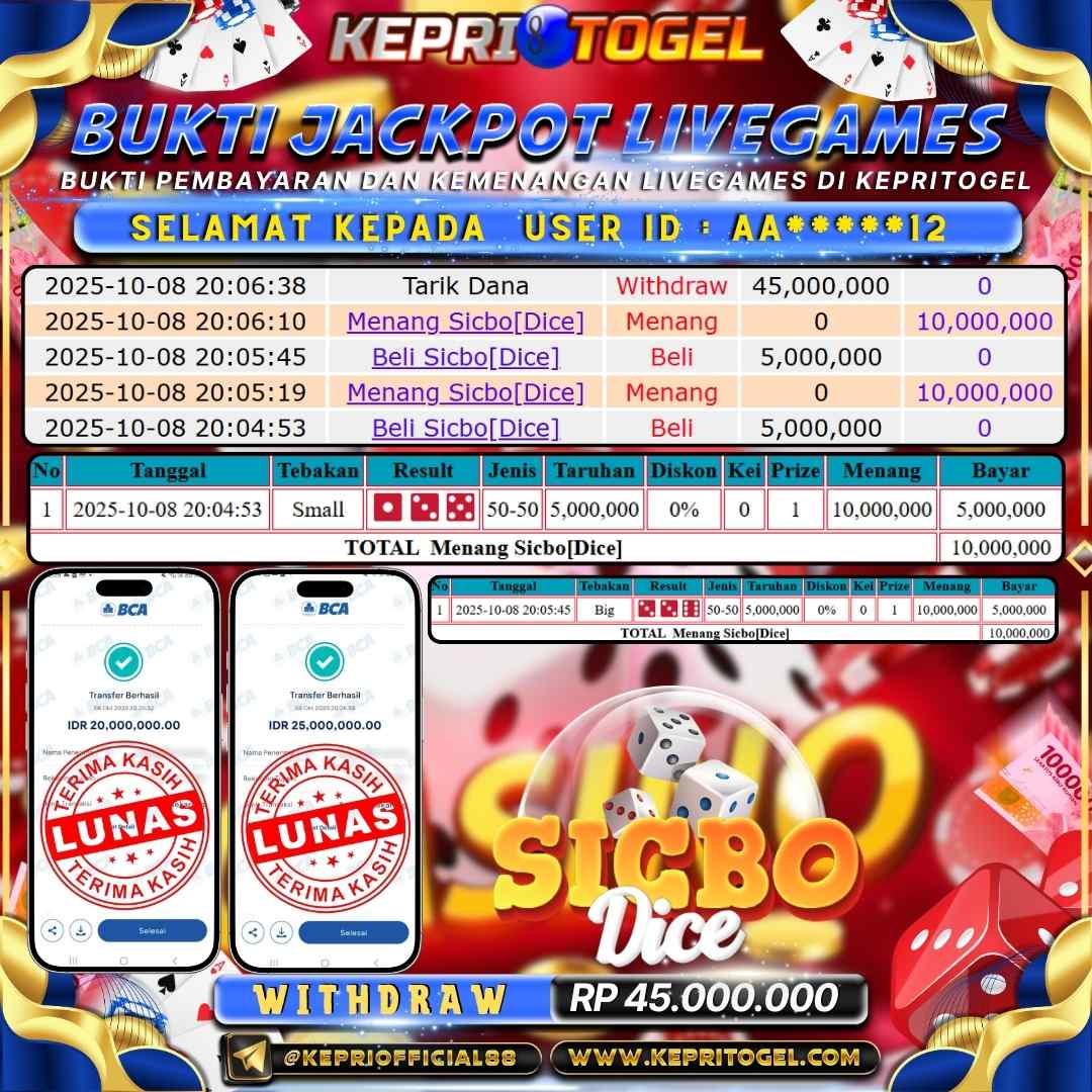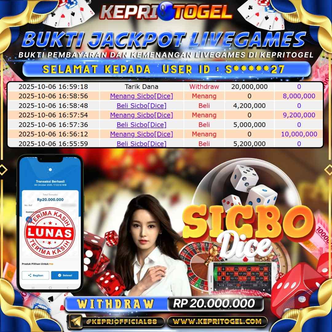 Kepritogel Jackpot Live Game Sicbo Dice Rp20,000,000