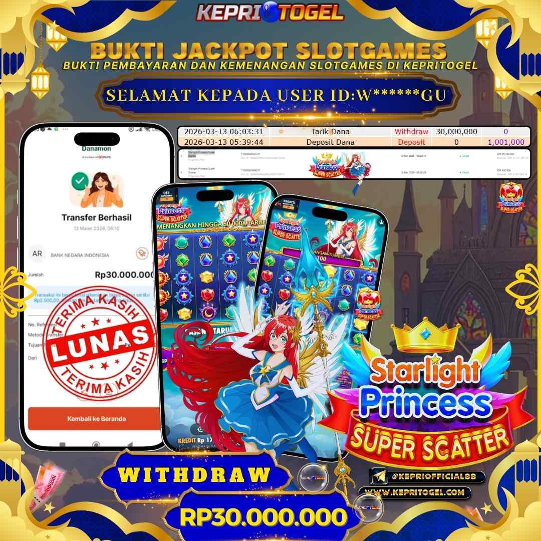 Selamat kepada UserId W******GU telah berhasil mendapatkan kemenangan jackpot pada permainan Slot Starlight Princess Super Scatter Kepritogel sebesar Rp30,000,000,- . Kepritogel situs terpercaya sejak dulu hingga saat ini , Untuk kemenangan berapapun pasti akan kami bayarkan . Jangan ragu bermain di Kepri Togel . Kami pihak Kepritogel Menyampaikan terima kasih kepada seluruh member Kepri Togel yang telah Percaya dan setia Bersama kami bermain di Kepritogel hingga saat ini.