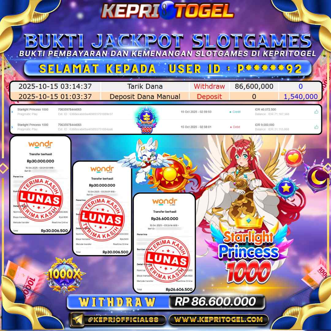 Kepritogel Jackpot Slot Starlight Princess 1000 Rp86,600,000