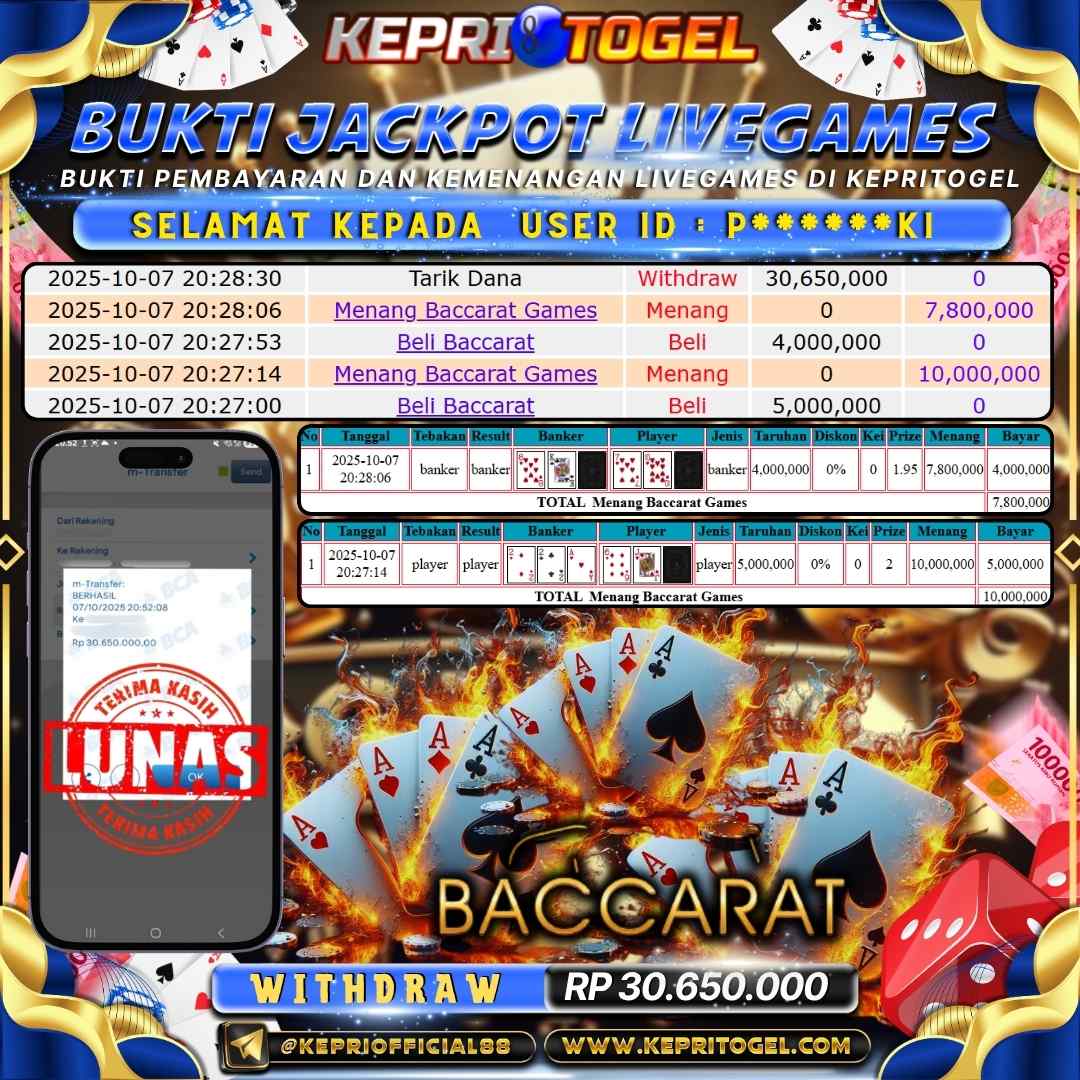 Kepritogel Jackpot Live Game Baccarat Rp30,650,000