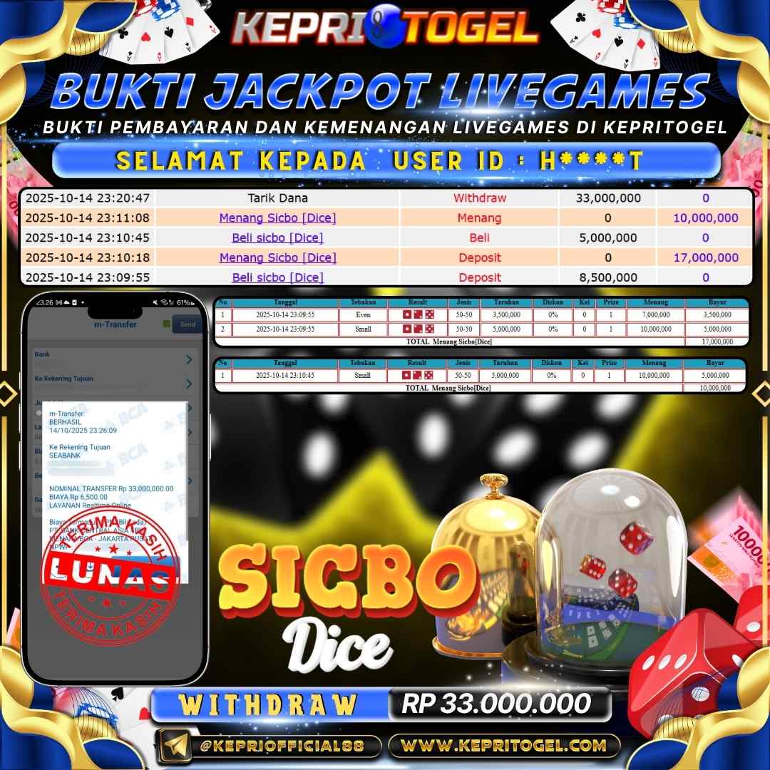 kepritogel Jackpot Live Game Sicbo Dice Rp33,000,000