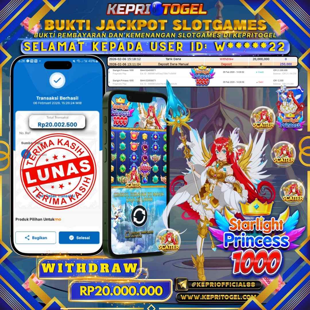 Selamat kepada UserId W*****22 telah berhasil mendapatkan kemenangan jackpot pada permainan Slot Starlight Princess 1000 Kepritogel sebesar Rp20,000,000,- . Kepritogel situs terpercaya sejak dulu hingga saat ini , Untuk kemenangan berapapun pasti akan kami bayarkan . Jangan ragu bermain di Kepri Togel . Kami pihak Kepritogel Menyampaikan terima kasih kepada seluruh member Kepri Togel yang telah Percaya dan setia Bersama kami bermain di Kepritogel hingga saat ini.
