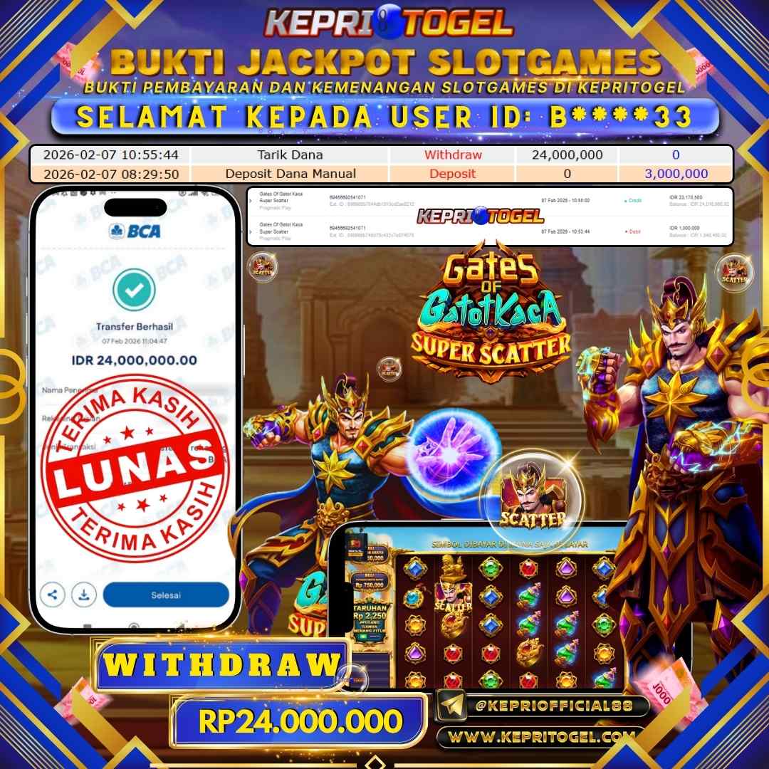 Selamat kepada UserId B****33 telah berhasil mendapatkan kemenangan jackpot pada permainan Slot Gates of Gatot Kaca Super Scatter Kepritogel sebesar Rp24,000,000,- . Kepritogel situs terpercaya sejak dulu hingga saat ini , Untuk kemenangan berapapun pasti akan kami bayarkan . Jangan ragu bermain di Kepri Togel . Kami pihak Kepritogel Menyampaikan terima kasih kepada seluruh member Kepri Togel yang telah Percaya dan setia Bersama kami bermain di Kepritogel hingga saat ini.