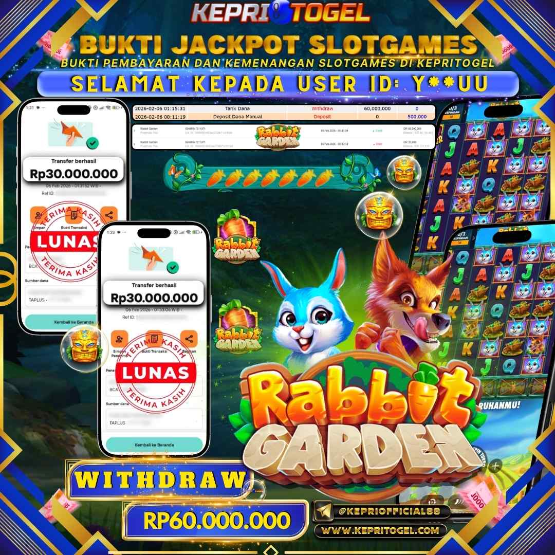 Selamat kepada UserId Y**UU telah berhasil mendapatkan kemenangan jackpot pada permainan Slot Rabbit Garden Kepritogel sebesar Rp60,000,000,- . Kepritogel situs terpercaya sejak dulu hingga saat ini , Untuk kemenangan berapapun pasti akan kami bayarkan . Jangan ragu bermain di Kepri Togel . Kami pihak Kepritogel Menyampaikan terima kasih kepada seluruh member Kepri Togel yang telah Percaya dan setia Bersama kami bermain di Kepritogel hingga saat ini.