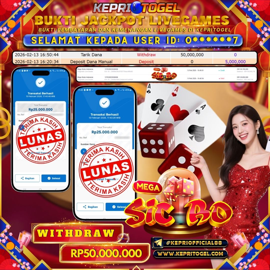 Selamat kepada UserId O******7 telah berhasil mendapatkan kemenangan jackpot pada permainan Live Game Mega Sicbo Kepritogel sebesar Rp50,000,000,- . Kepritogel situs terpercaya sejak dulu hingga saat ini , Untuk kemenangan berapapun pasti akan kami bayarkan . Jangan ragu bermain di Kepri Togel . Kami pihak Kepritogel Menyampaikan terima kasih kepada seluruh member Kepri Togel yang telah Percaya dan setia Bersama kami bermain di Kepritogel hingga saat ini.
