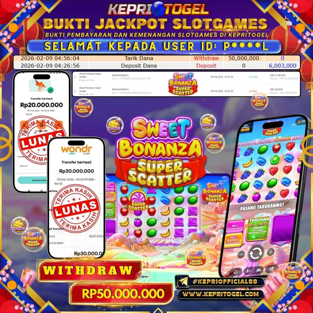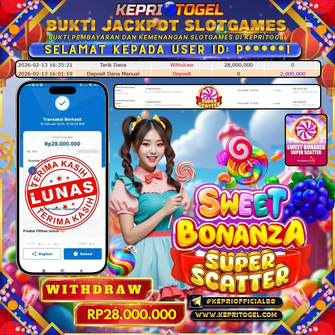 Selamat kepada UserId P*****1 telah berhasil mendapatkan kemenangan jackpot pada permainan Slot Sweet Bonanza Super Scatter Kepritogel sebesar Rp28,000,000,- . Kepritogel situs terpercaya sejak dulu hingga saat ini , Untuk kemenangan berapapun pasti akan kami bayarkan . Jangan ragu bermain di Kepri Togel . Kami pihak Kepritogel Menyampaikan terima kasih kepada seluruh member Kepri Togel yang telah Percaya dan setia Bersama kami bermain di Kepritogel hingga saat ini.