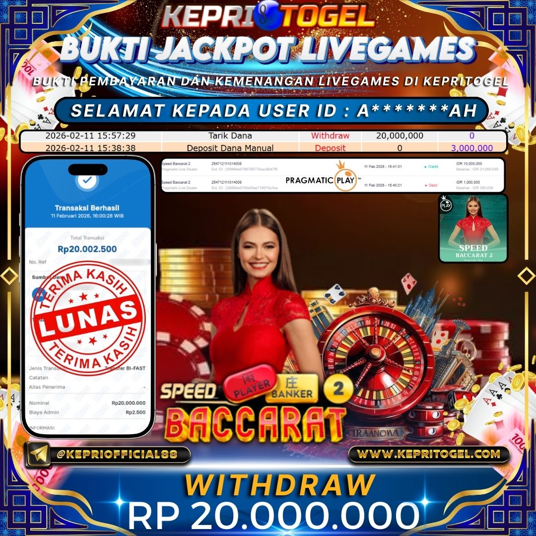 Selamat kepada UserId A*******AH telah berhasil mendapatkan kemenangan jackpot pada permainan Live Game Speed baccarat 2 Kepritogel sebesar Rp20,000,000,- . Kepritogel situs terpercaya sejak dulu hingga saat ini , Untuk kemenangan berapapun pasti akan kami bayarkan . Jangan ragu bermain di Kepri Togel . Kami pihak Kepritogel Menyampaikan terima kasih kepada seluruh member Kepri Togel yang telah Percaya dan setia Bersama kami bermain di Kepritogel hingga saat ini.