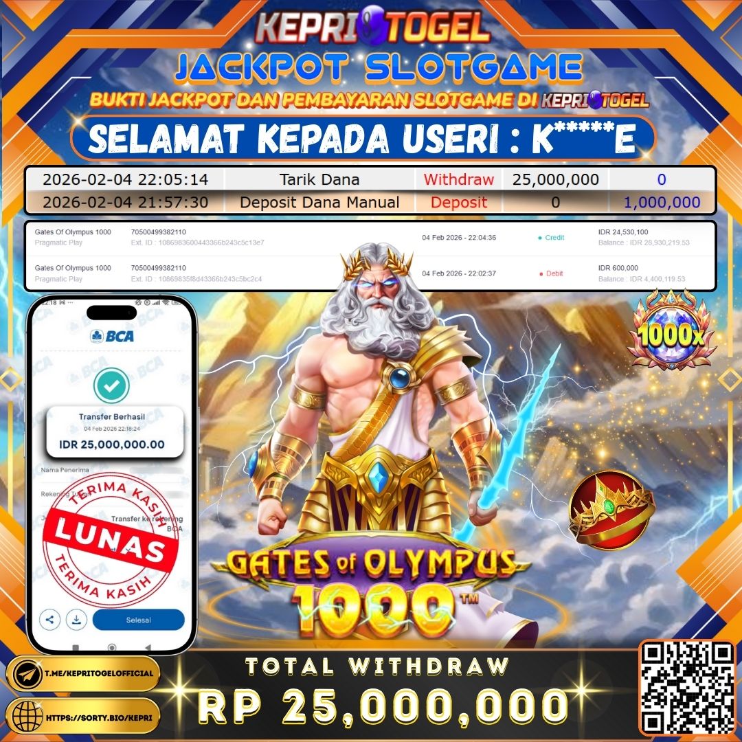 Selamat kepada UserId K*****E telah berhasil mendapatkan kemenangan jackpot pada permainan Slot Gates Of Olympus 1000 Kepritogel sebesar Rp25,000,000,- . Kepritogel situs terpercaya sejak dulu hingga saat ini , Untuk kemenangan berapapun pasti akan kami bayarkan . Jangan ragu bermain di Kepri Togel . Kami pihak Kepritogel Menyampaikan terima kasih kepada seluruh member Kepri Togel yang telah Percaya dan setia Bersama kami bermain di Kepritogel hingga saat ini.