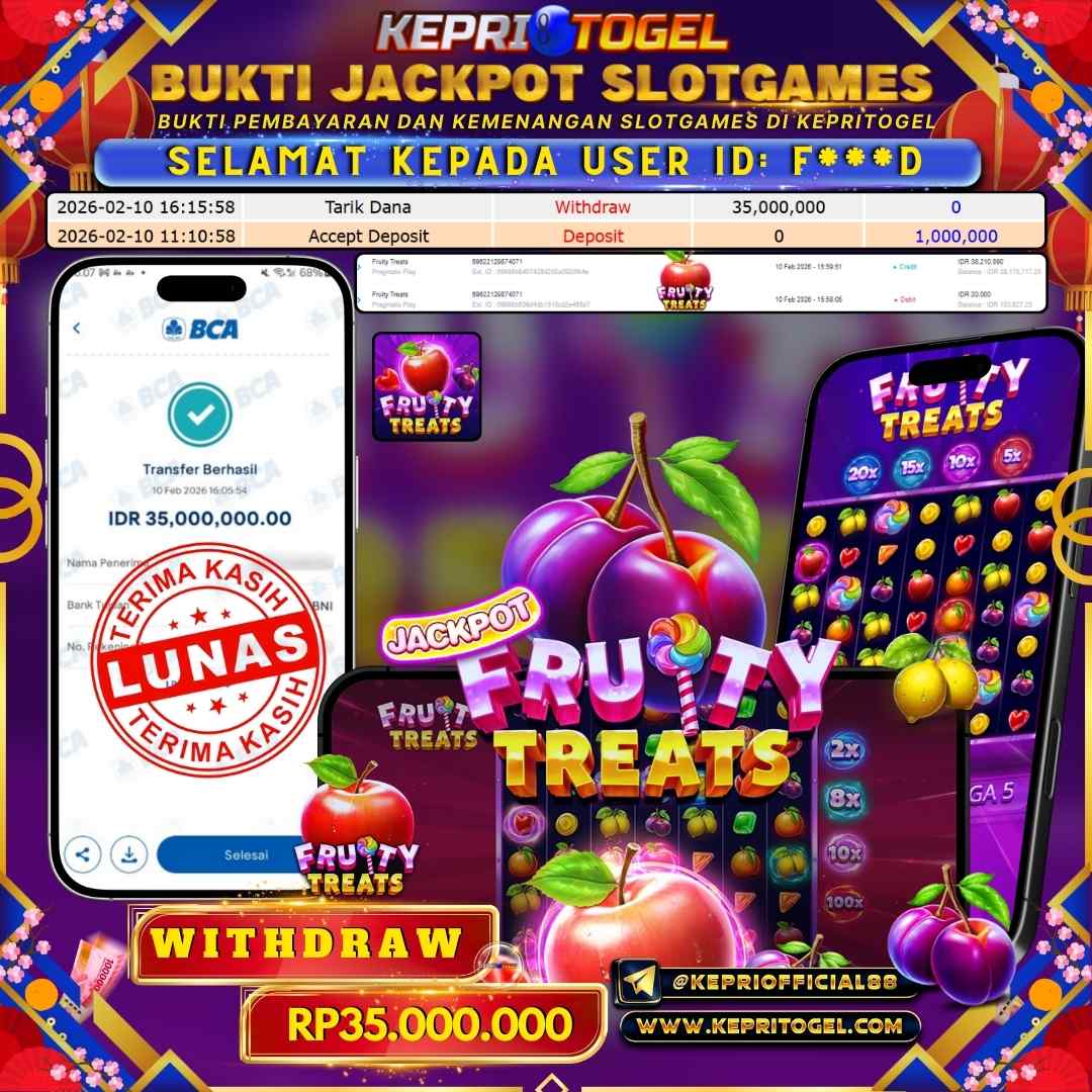 Selamat kepada UserId F***D telah berhasil mendapatkan kemenangan jackpot pada permainan Slot Fruity Treats Kepritogel sebesar Rp35,000,000,- . Kepritogel situs terpercaya sejak dulu hingga saat ini , Untuk kemenangan berapapun pasti akan kami bayarkan . Jangan ragu bermain di Kepri Togel . Kami pihak Kepritogel Menyampaikan terima kasih kepada seluruh member Kepri Togel yang telah Percaya dan setia Bersama kami bermain di Kepritogel hingga saat ini.