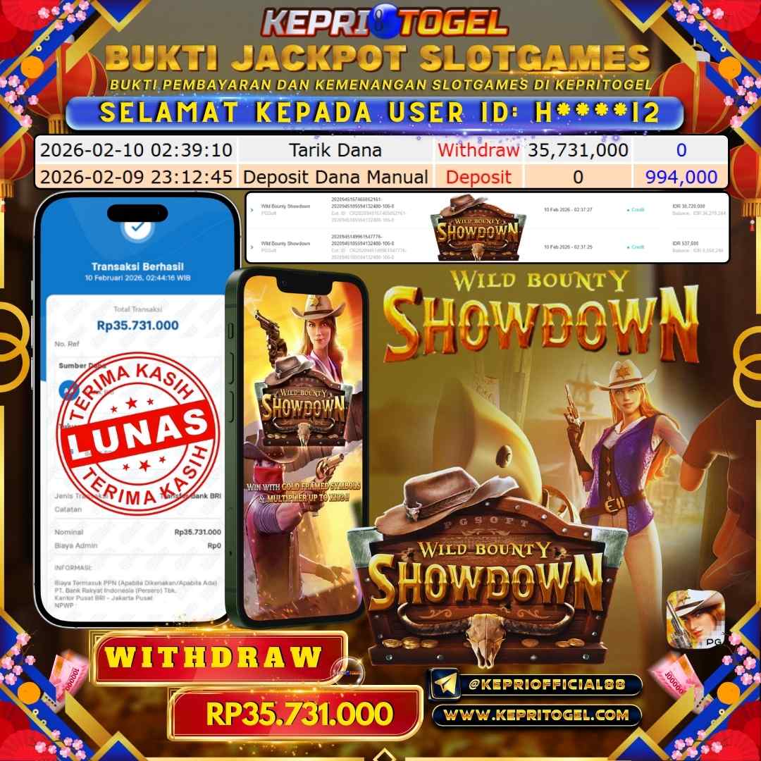 Selamat kepada UserId H****I2 telah berhasil mendapatkan kemenangan jackpot pada permainan Slot Wild Bounty Showdown Kepritogel sebesar Rp35,731,000,- . Kepritogel situs terpercaya sejak dulu hingga saat ini , Untuk kemenangan berapapun pasti akan kami bayarkan . Jangan ragu bermain di Kepri Togel . Kami pihak Kepritogel Menyampaikan terima kasih kepada seluruh member Kepri Togel yang telah Percaya dan setia Bersama kami bermain di Kepritogel hingga saat ini.