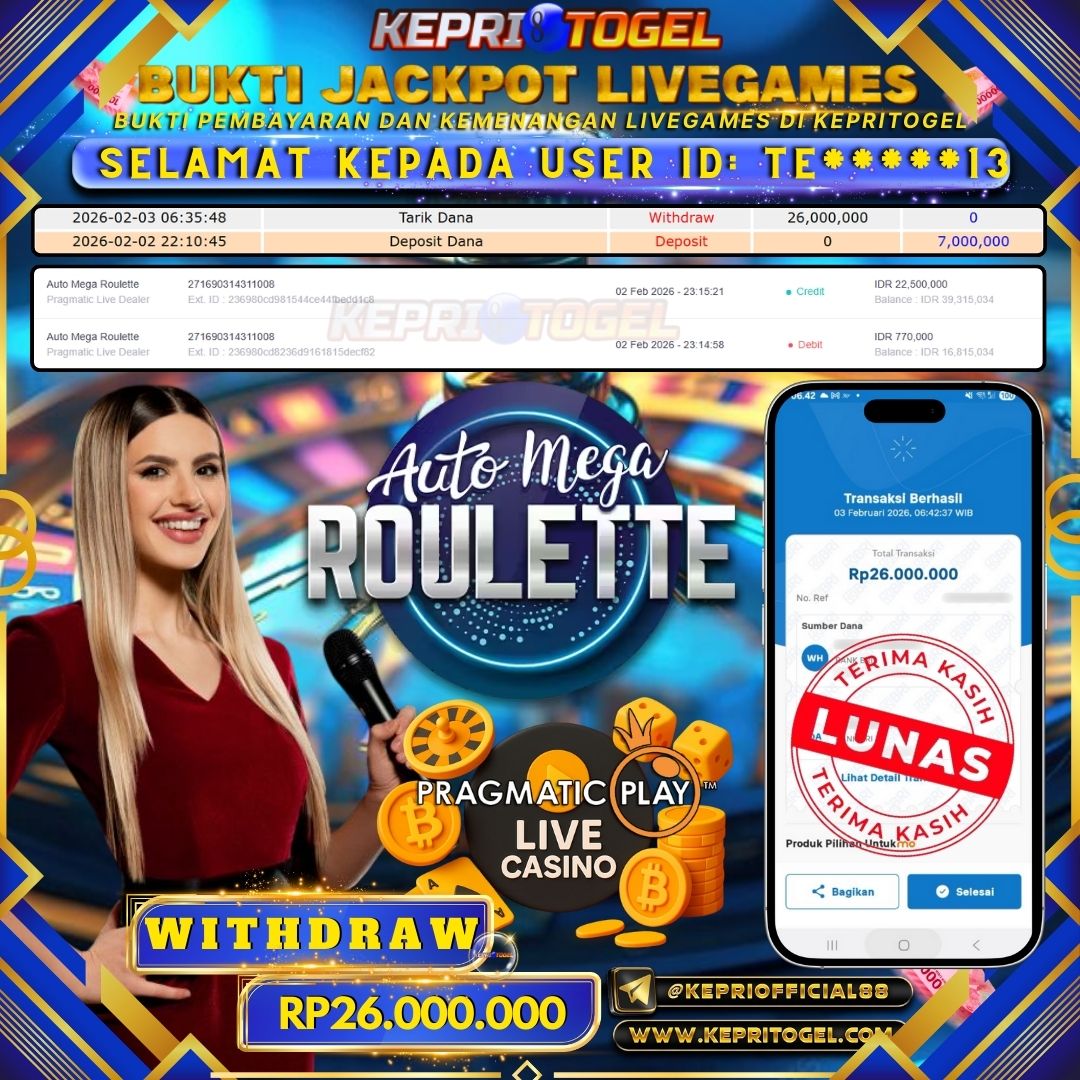 Selamat kepada UserId TE*****13 telah berhasil mendapatkan kemenangan jackpot pada permainan Live Game Auto Mega Roulette Kepritogel sebesar Rp26,000,000,- . Kepritogel situs terpercaya sejak dulu hingga saat ini , Untuk kemenangan berapapun pasti akan kami bayarkan . Jangan ragu bermain di Kepri Togel . Kami pihak Kepritogel Menyampaikan terima kasih kepada seluruh member Kepri Togel yang telah Percaya dan setia Bersama kami bermain di Kepritogel hingga saat ini.