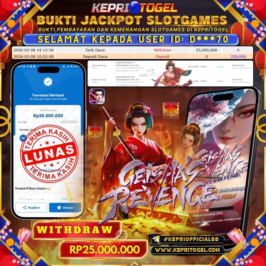 Selamat kepada UserId D***70 telah berhasil mendapatkan kemenangan jackpot pada permainan slot Geisha's Revenge Kepritogel sebesar Rp25,000,000,- . Kepritogel situs terpercaya sejak dulu hingga saat ini , Untuk kemenangan berapapun pasti akan kami bayarkan . Jangan ragu bermain di Kepri Togel . Kami pihak Kepritogel Menyampaikan terima kasih kepada seluruh member Kepri Togel yang telah Percaya dan setia Bersama kami bermain di Kepritogel hingga saat ini.