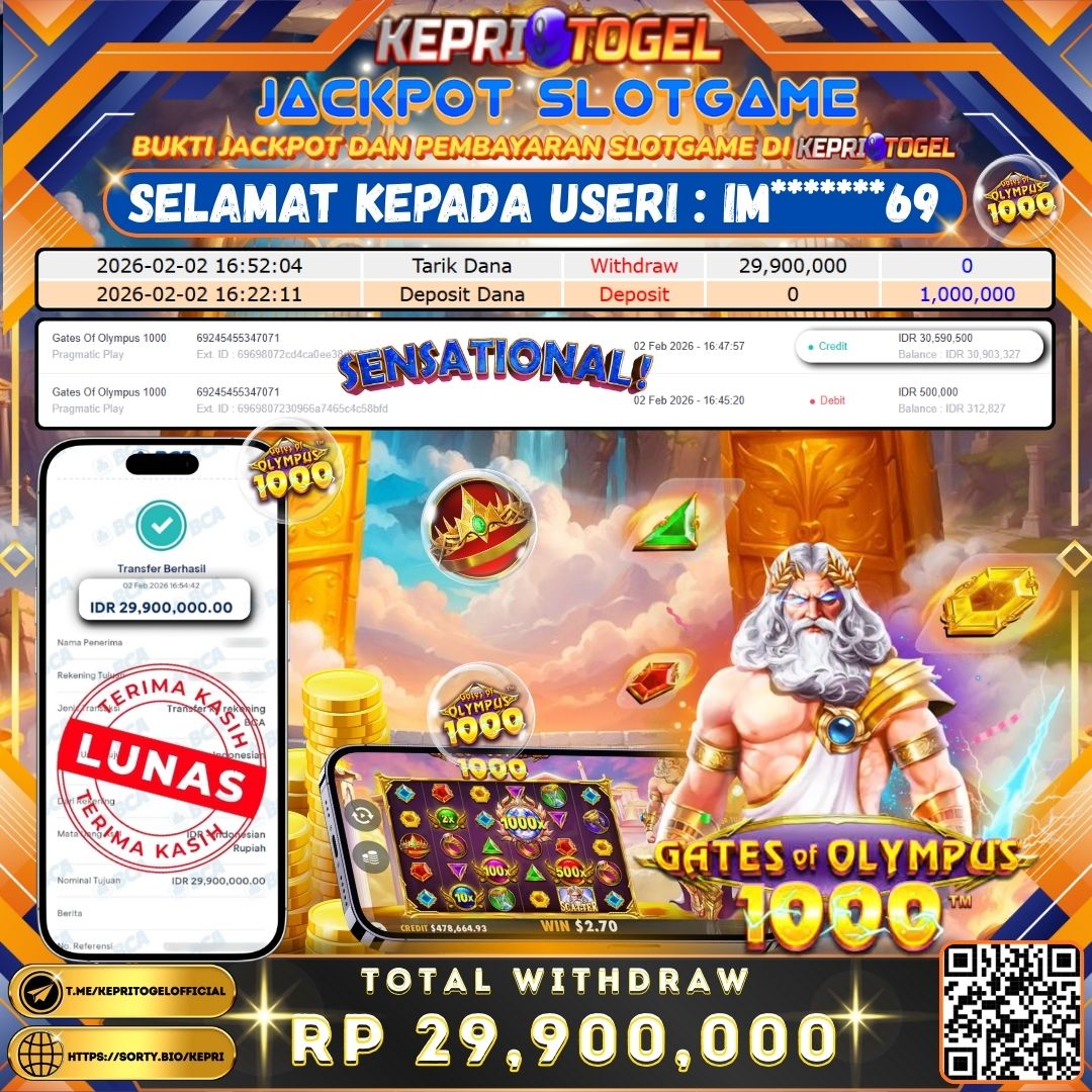Selamat kepada UserId IM*******69 telah berhasil mendapatkan kemenangan jackpot pada permainan Slot Gates Of Olympus 1000 Kepritogel sebesar Rp29,900,000,- . Kepritogel situs terpercaya sejak dulu hingga saat ini , Untuk kemenangan berapapun pasti akan kami bayarkan . Jangan ragu bermain di Kepri Togel . Kami pihak Kepritogel Menyampaikan terima kasih kepada seluruh member Kepri Togel yang telah Percaya dan setia Bersama kami bermain di Kepritogel hingga saat ini.