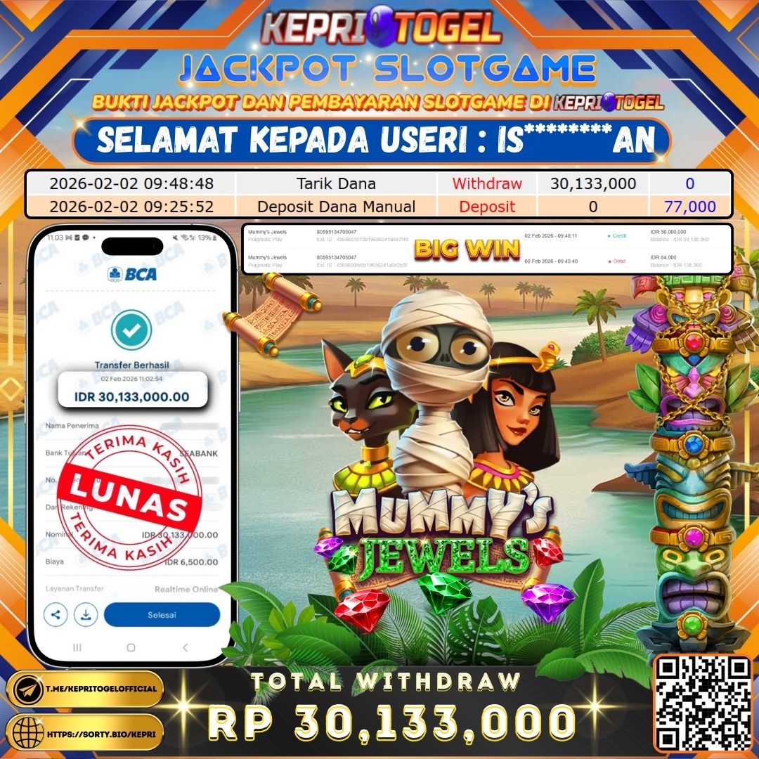 Selamat kepada UserId IS********AN telah berhasil mendapatkan kemenangan jackpot pada permainan Slot Mummy's Jewels Kepritogel sebesar Rp30,133,000- . Kepritogel situs terpercaya sejak dulu hingga saat ini , Untuk kemenangan berapapun pasti akan kami bayarkan . Jangan ragu bermain di Kepri Togel . Kami pihak Kepritogel Menyampaikan terima kasih kepada seluruh member Kepri Togel yang telah Percaya dan setia Bersama kami bermain di Kepritogel hingga saat ini.