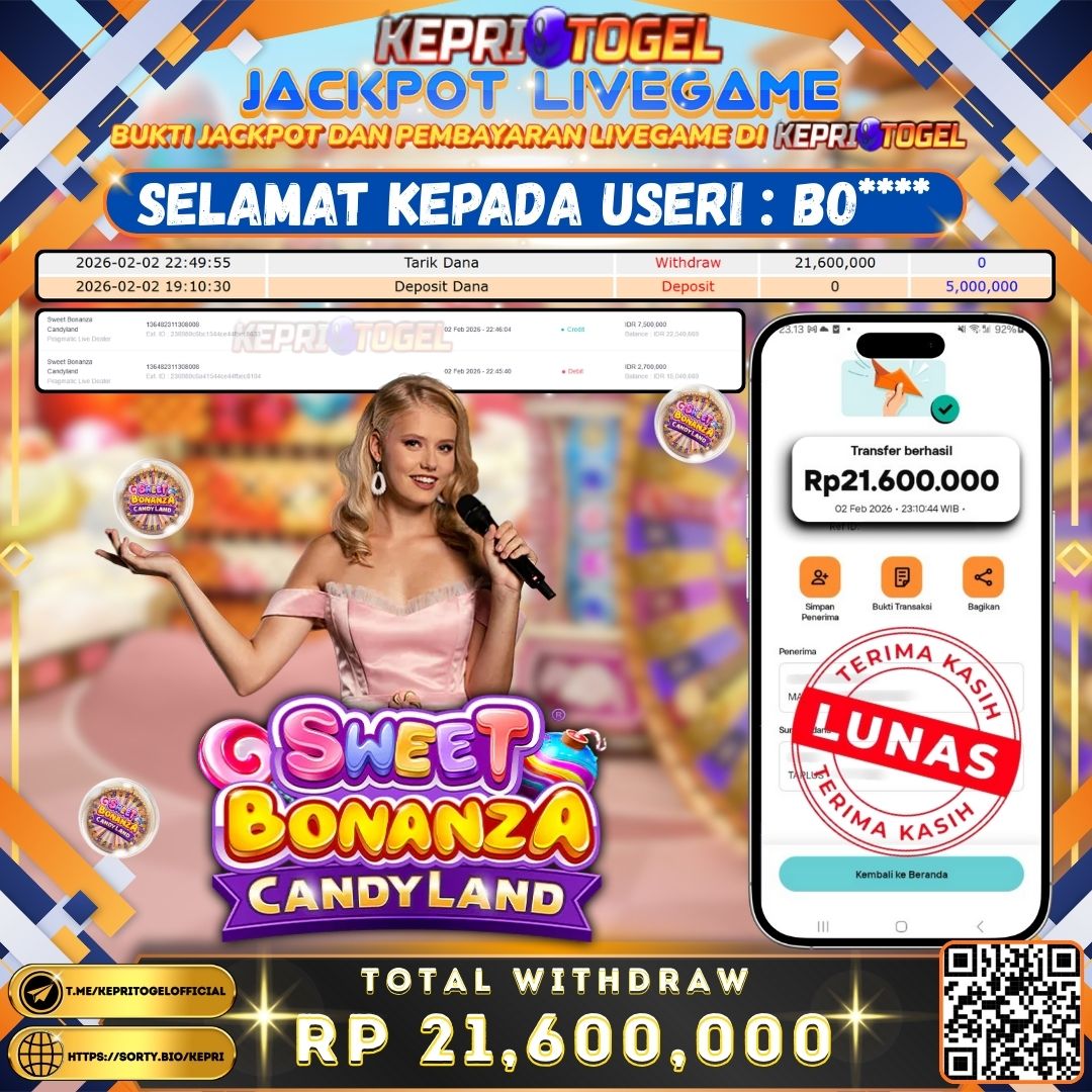 Selamat kepada UserId BO**** telah berhasil mendapatkan kemenangan jackpot pada permainan Live Game Sweet Bonanza Candyland Kepritogel sebesar Rp21,600,000,- . Kepritogel situs terpercaya sejak dulu hingga saat ini , Untuk kemenangan berapapun pasti akan kami bayarkan . Jangan ragu bermain di Kepri Togel . Kami pihak Kepritogel Menyampaikan terima kasih kepada seluruh member Kepri Togel yang telah Percaya dan setia Bersama kami bermain di Kepritogel hingga saat ini.