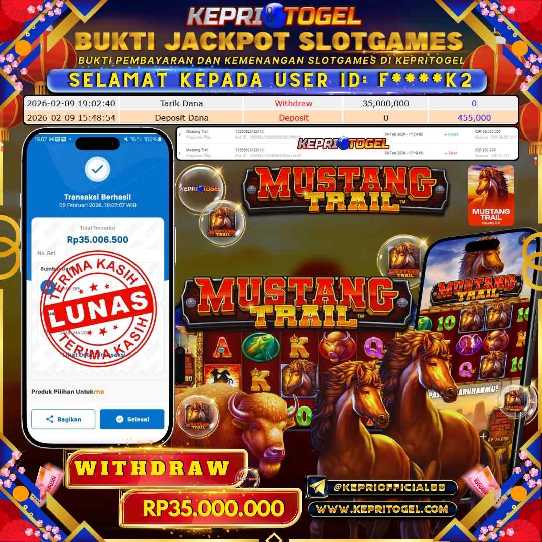 Selamat kepada UserId F****K2 telah berhasil mendapatkan kemenangan jackpot pada permainan slot Mustang Trail Kepritogel sebesar Rp35,000,000,- . Kepritogel situs terpercaya sejak dulu hingga saat ini , Untuk kemenangan berapapun pasti akan kami bayarkan . Jangan ragu bermain di Kepri Togel . Kami pihak Kepritogel Menyampaikan terima kasih kepada seluruh member Kepri Togel yang telah Percaya dan setia Bersama kami bermain di Kepritogel hingga saat ini.