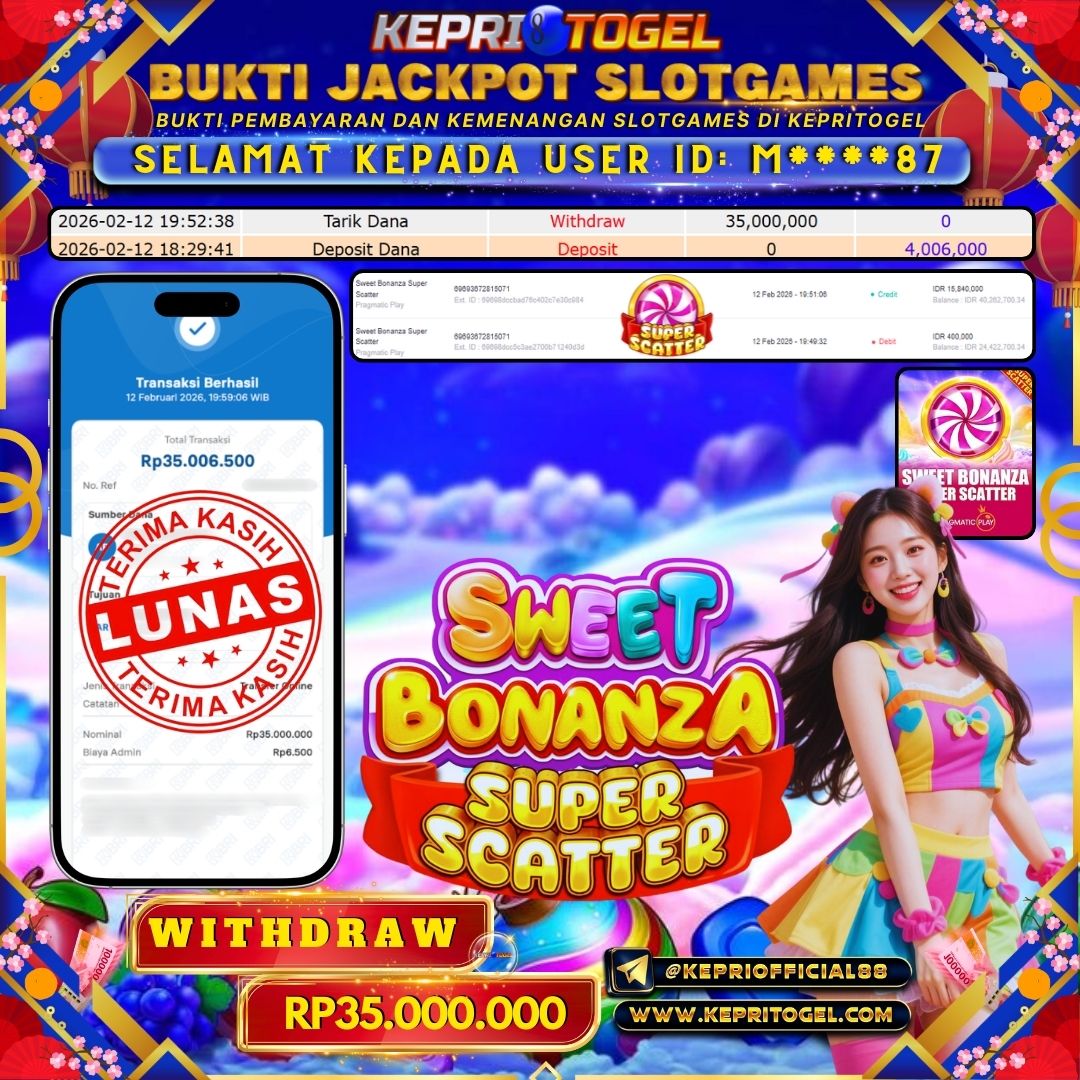 Selamat kepada UserId M****87 telah berhasil mendapatkan kemenangan jackpot pada permainan Slot Sweet Bonanza Super Scatter Kepritogel sebesar Rp35,000,000,- . Kepritogel situs terpercaya sejak dulu hingga saat ini , Untuk kemenangan berapapun pasti akan kami bayarkan . Jangan ragu bermain di Kepri Togel . Kami pihak Kepritogel Menyampaikan terima kasih kepada seluruh member Kepri Togel yang telah Percaya dan setia Bersama kami bermain di Kepritogel hingga saat ini.
