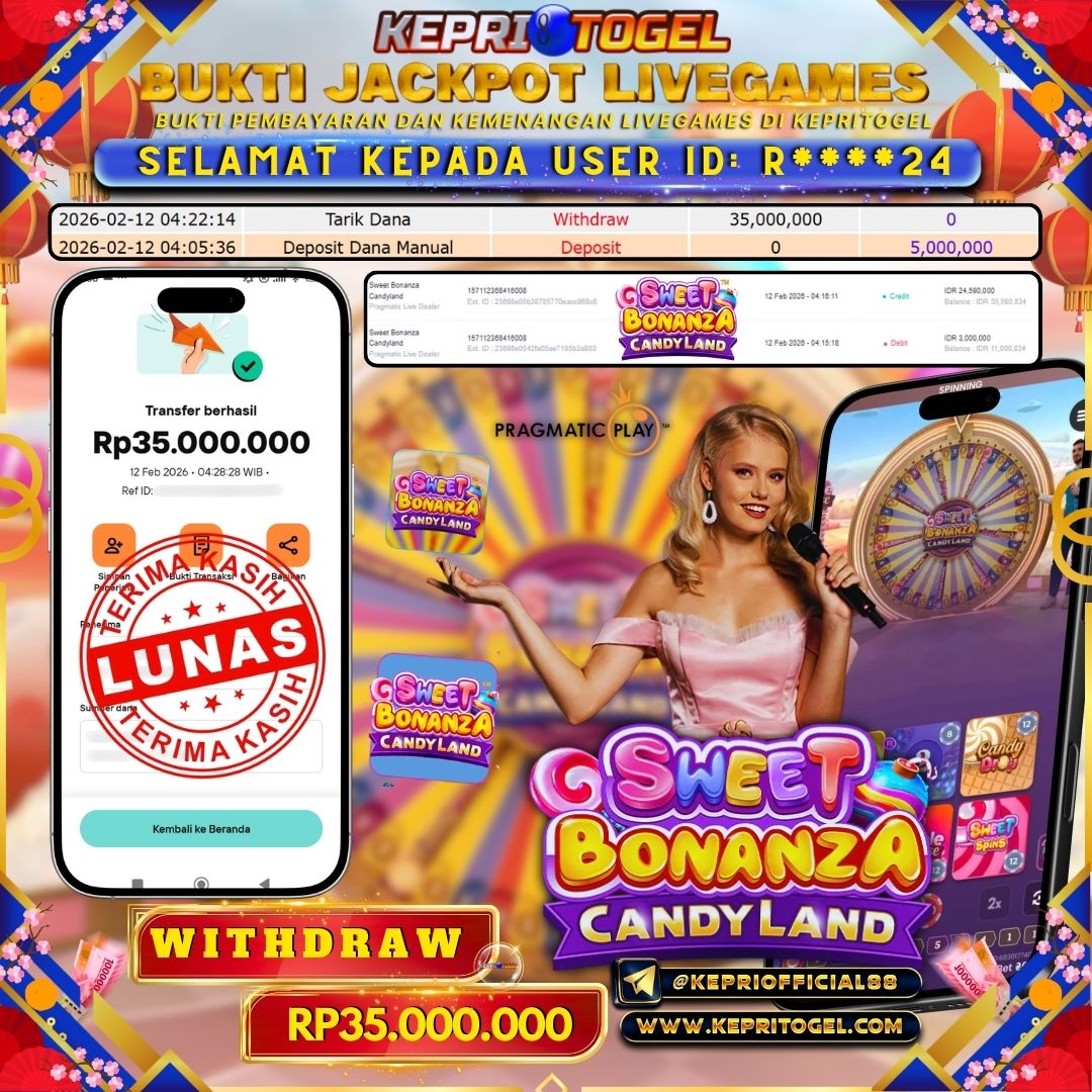 Selamat kepada UserId R****24 telah berhasil mendapatkan kemenangan jackpot pada permainan Live Game Sweet Bonanza Candyland Kepritogel sebesar Rp35,000,000,- . Kepritogel situs terpercaya sejak dulu hingga saat ini , Untuk kemenangan berapapun pasti akan kami bayarkan . Jangan ragu bermain di Kepri Togel . Kami pihak Kepritogel Menyampaikan terima kasih kepada seluruh member Kepri Togel yang telah Percaya dan setia Bersama kami bermain di Kepritogel hingga saat ini.