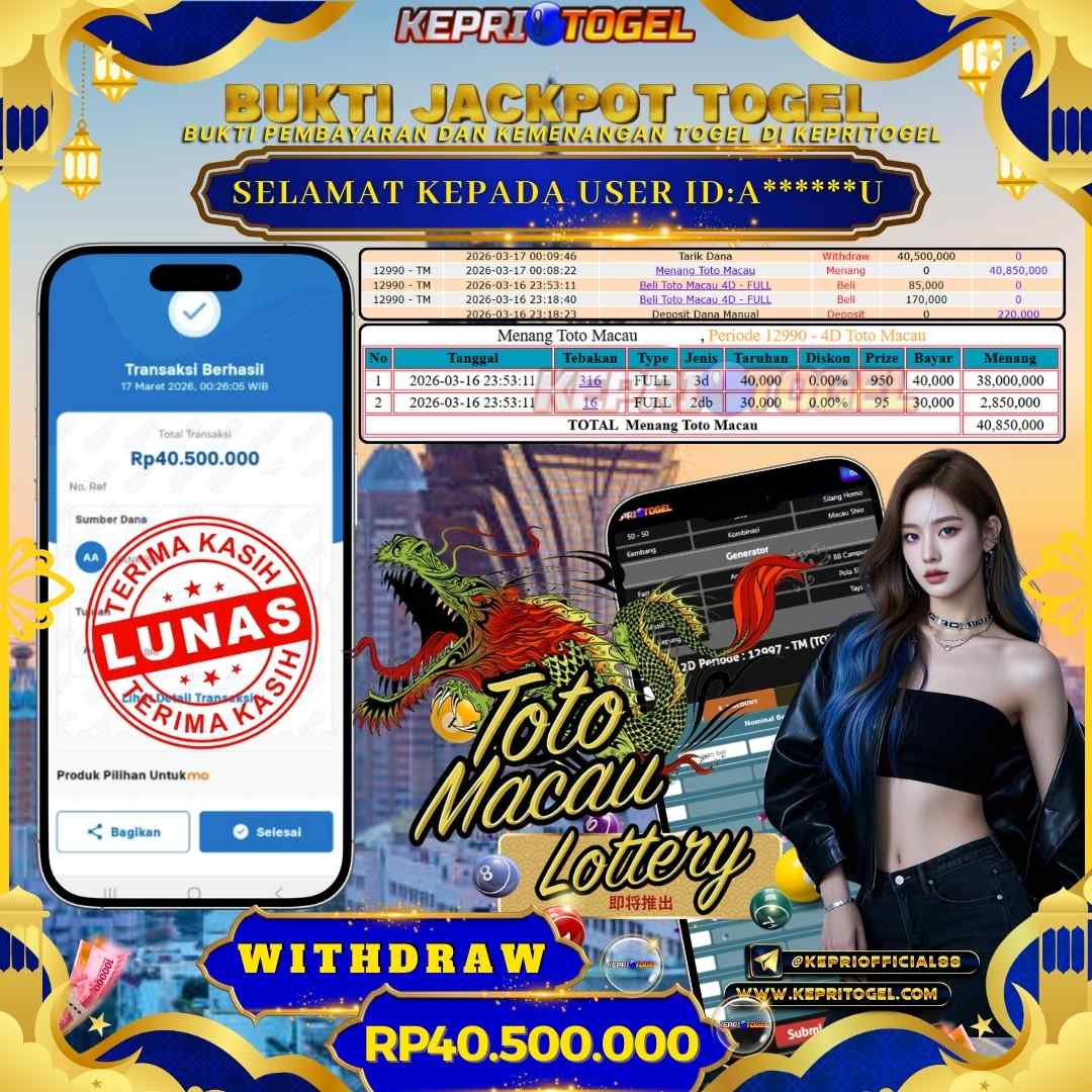 Selamat kepada UserId A******U telah berhasil mendapatkan kemenangan jackpot pada Togel Toto Macau 4D Kepritogel sebesar Rp40,500,000,- . Kepritogel situs terpercaya sejak dulu hingga saat ini , Untuk kemenangan berapapun pasti akan kami bayarkan . Jangan ragu bermain di Kepri Togel . Kami pihak Kepritogel Menyampaikan terima kasih kepada seluruh member Kepri Togel yang telah Percaya dan setia Bersama kami bermain di Kepritogel hingga saat ini.