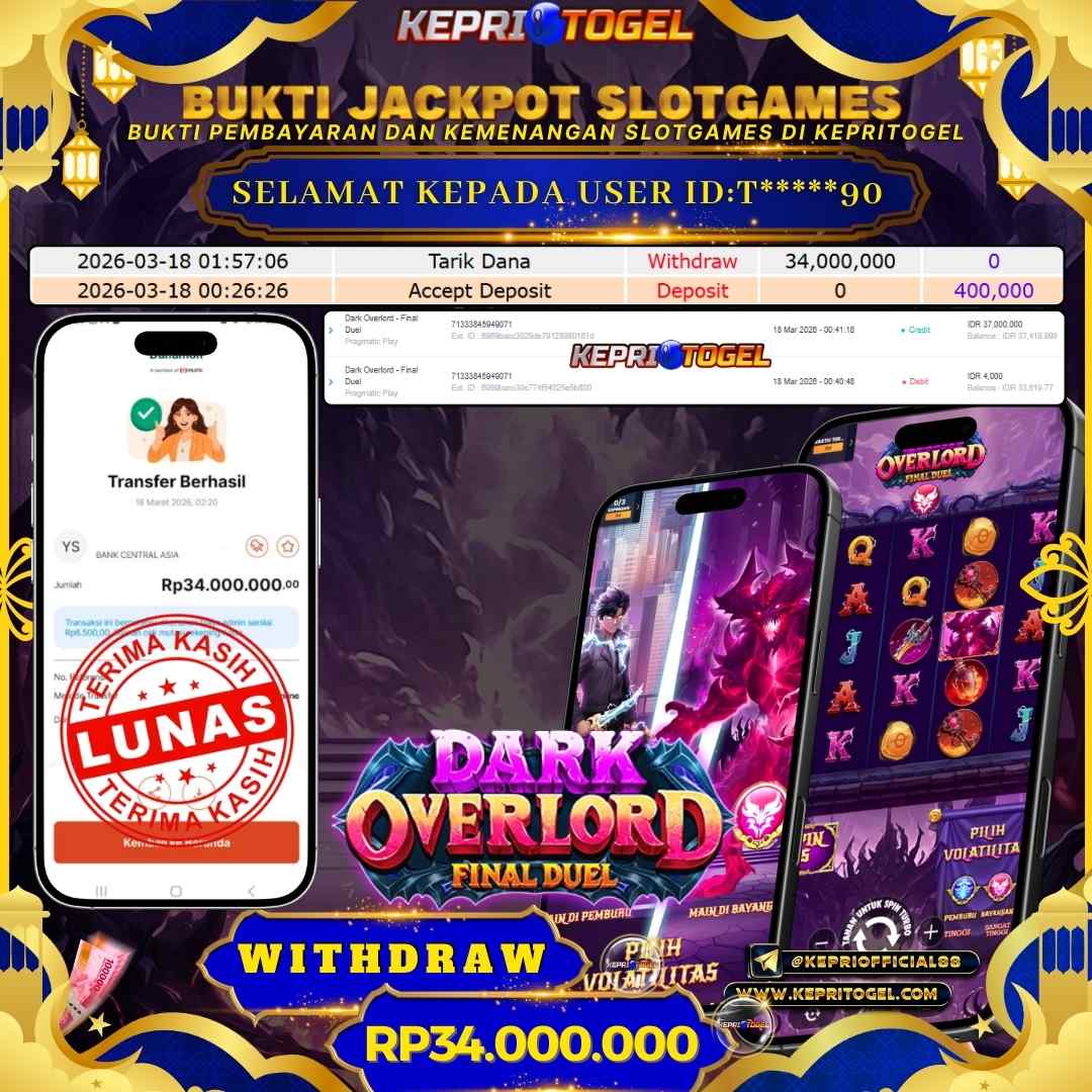 Selamat kepada UserId T*****90 telah berhasil mendapatkan kemenangan jackpot pada permainan Slot Dark Overlord - Final Duel Kepritogel sebesar Rp34,000,000,- . Kepritogel situs terpercaya sejak dulu hingga saat ini , Untuk kemenangan berapapun pasti akan kami bayarkan . Jangan ragu bermain di Kepri Togel . Kami pihak Kepritogel Menyampaikan terima kasih kepada seluruh member Kepri Togel yang telah Percaya dan setia Bersama kami bermain di Kepritogel hingga saat ini.