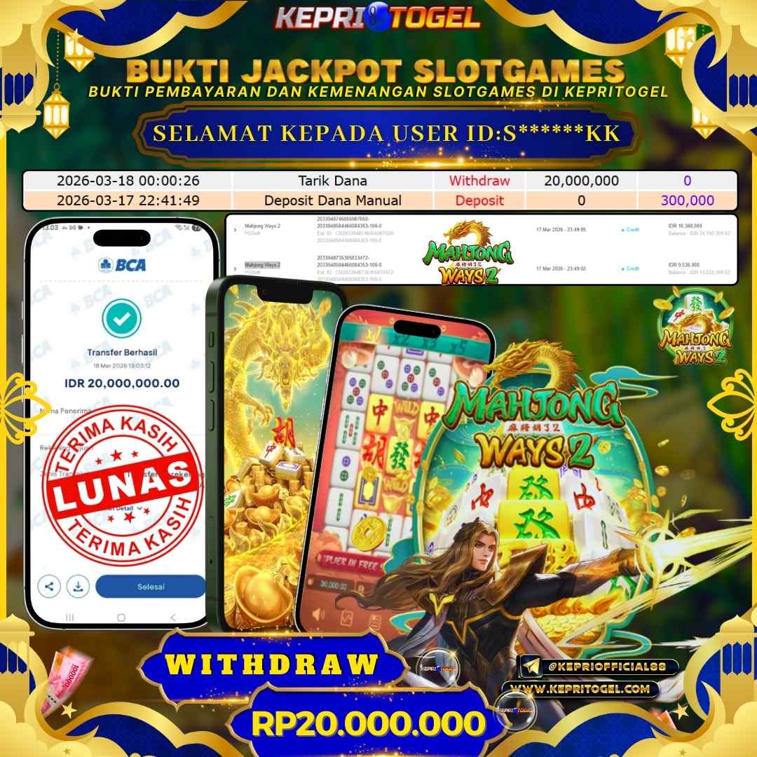 Selamat kepada UserId S******KK telah berhasil mendapatkan kemenangan jackpot pada permainan slot Mahjong Ways 2 Kepritogel sebesar Rp20,000,000,- . Kepritogel situs terpercaya sejak dulu hingga saat ini , Untuk kemenangan berapapun pasti akan kami bayarkan . Jangan ragu bermain di Kepri Togel . Kami pihak Kepritogel Menyampaikan terima kasih kepada seluruh member Kepri Togel yang telah Percaya dan setia Bersama kami bermain di Kepritogel hingga saat ini.