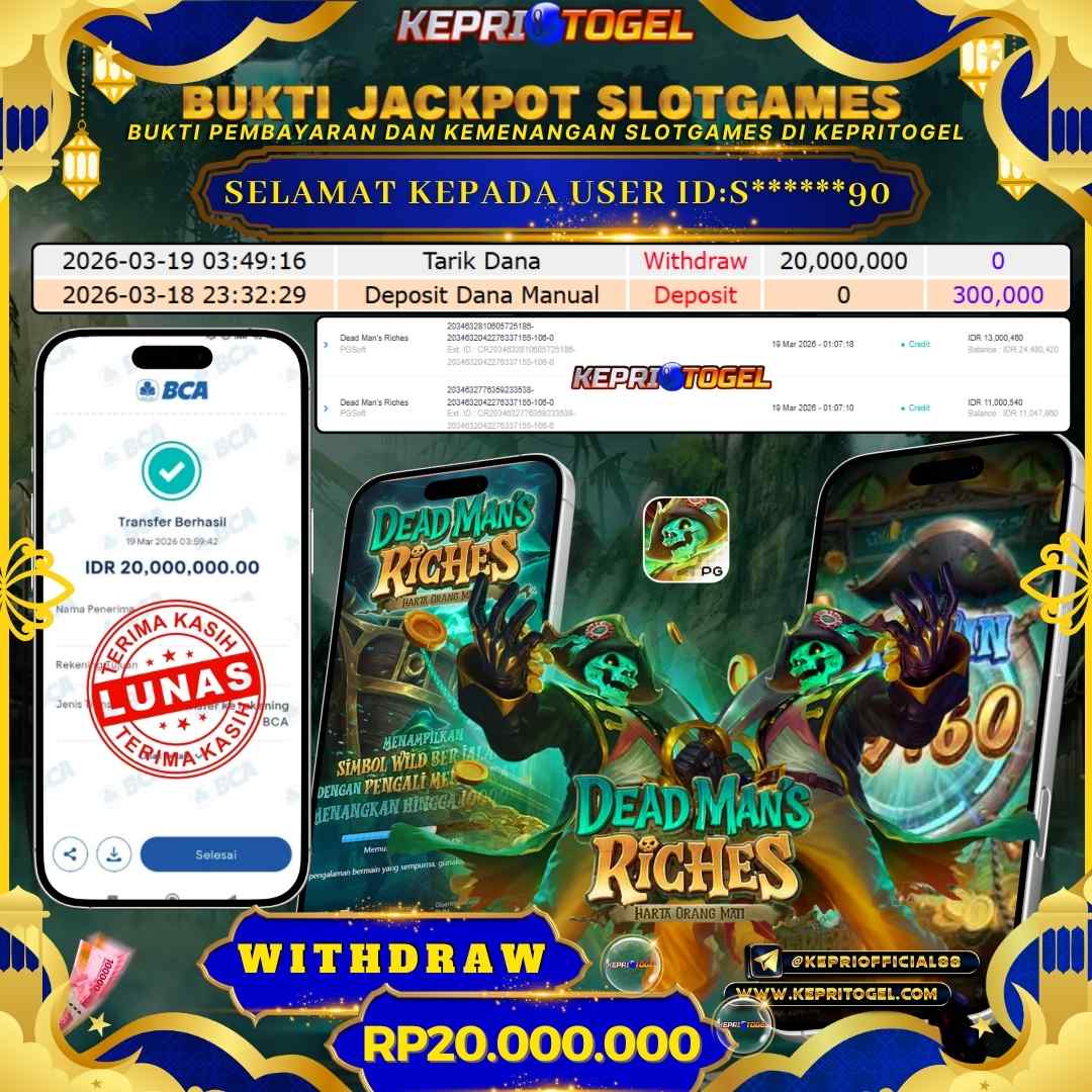 Selamat kepada UserId S******90 telah berhasil mendapatkan kemenangan jackpot pada permainan Slot Dead Man's Riches Kepritogel sebesar Rp20,000,000,- . Kepritogel situs terpercaya sejak dulu hingga saat ini , Untuk kemenangan berapapun pasti akan kami bayarkan . Jangan ragu bermain di Kepri Togel . Kami pihak Kepritogel Menyampaikan terima kasih kepada seluruh member Kepri Togel yang telah Percaya dan setia Bersama kami bermain di Kepritogel hingga saat ini.