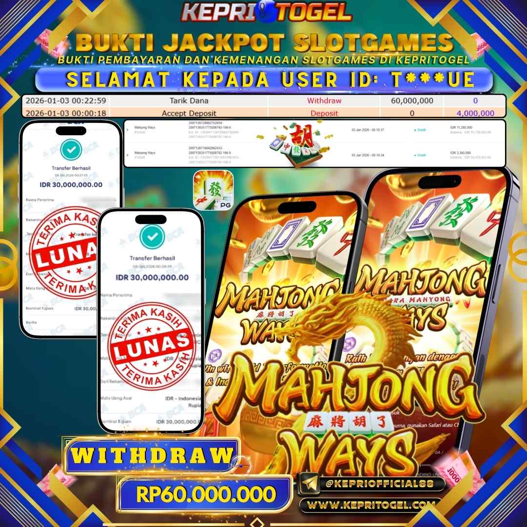 Selamat kepada UserId T***UE telah berhasil mendapatkan kemenangan jackpot pada permainan Slot Mahjong Ways Kepritogel sebesar Rp60,000,000,- . Kepritogel situs terpercaya sejak dulu hingga saat ini , Untuk kemenangan berapapun pasti akan kami bayarkan . Jangan ragu bermain di Kepri Togel . Kami pihak Kepritogel Menyampaikan terima kasih kepada seluruh member Kepri Togel yang telah Percaya dan setia Bersama kami bermain di Kepritogel hingga saat ini.