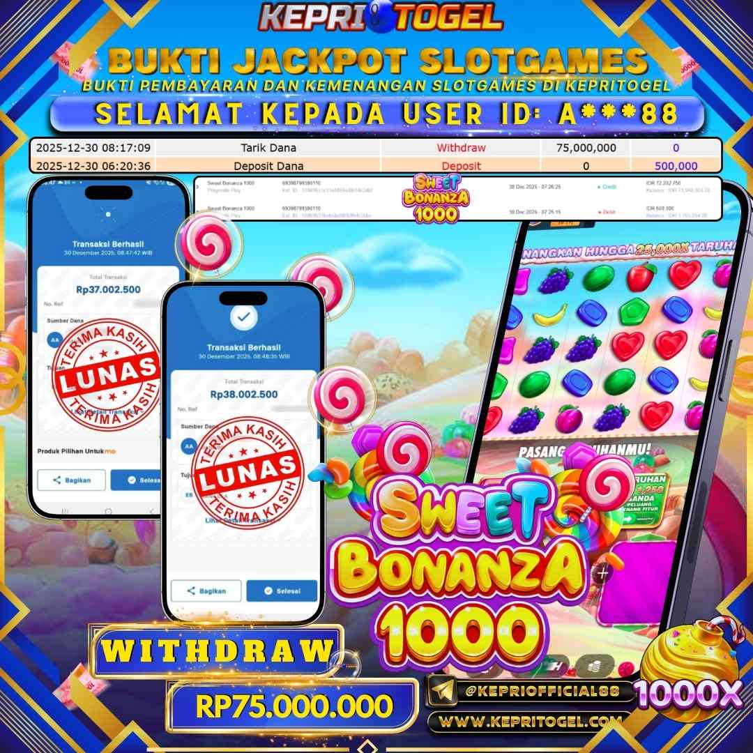 Selamat kepada UserId A***88 telah berhasil mendapatkan kemenangan jackpot pada permainan Slot Sweet Bonanza 1000 Kepritogel sebesar Rp75,000,000,- . Kepritogel situs terpercaya sejak dulu hingga saat ini , Untuk kemenangan berapapun pasti akan kami bayarkan . Jangan ragu bermain di Kepri Togel . Kami pihak Kepritogel Menyampaikan terima kasih kepada seluruh member Kepri Togel yang telah Percaya dan setia Bersama kami bermain di Kepritogel hingga saat ini.