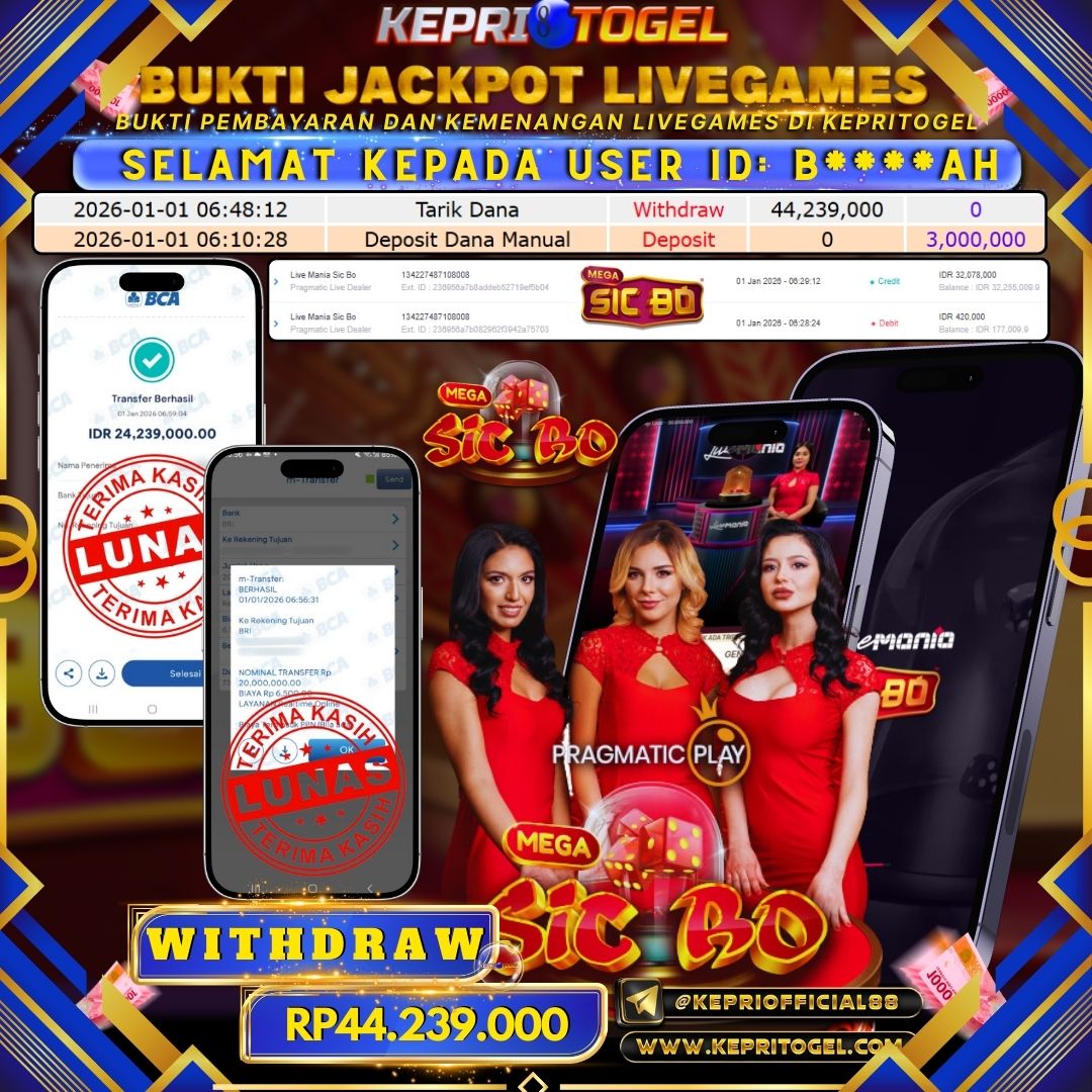 Selamat kepada UserId B****AH telah berhasil mendapatkan kemenangan jackpot pada permainan Live Game Mega Sic bo Kepritogel sebesar Rp44,239,000,- . Kepritogel situs terpercaya sejak dulu hingga saat ini , Untuk kemenangan berapapun pasti akan kami bayarkan . Jangan ragu bermain di Kepri Togel . Kami pihak Kepritogel Menyampaikan terima kasih kepada seluruh member Kepri Togel yang telah Percaya dan setia Bersama kami bermain di Kepritogel hingga saat ini.