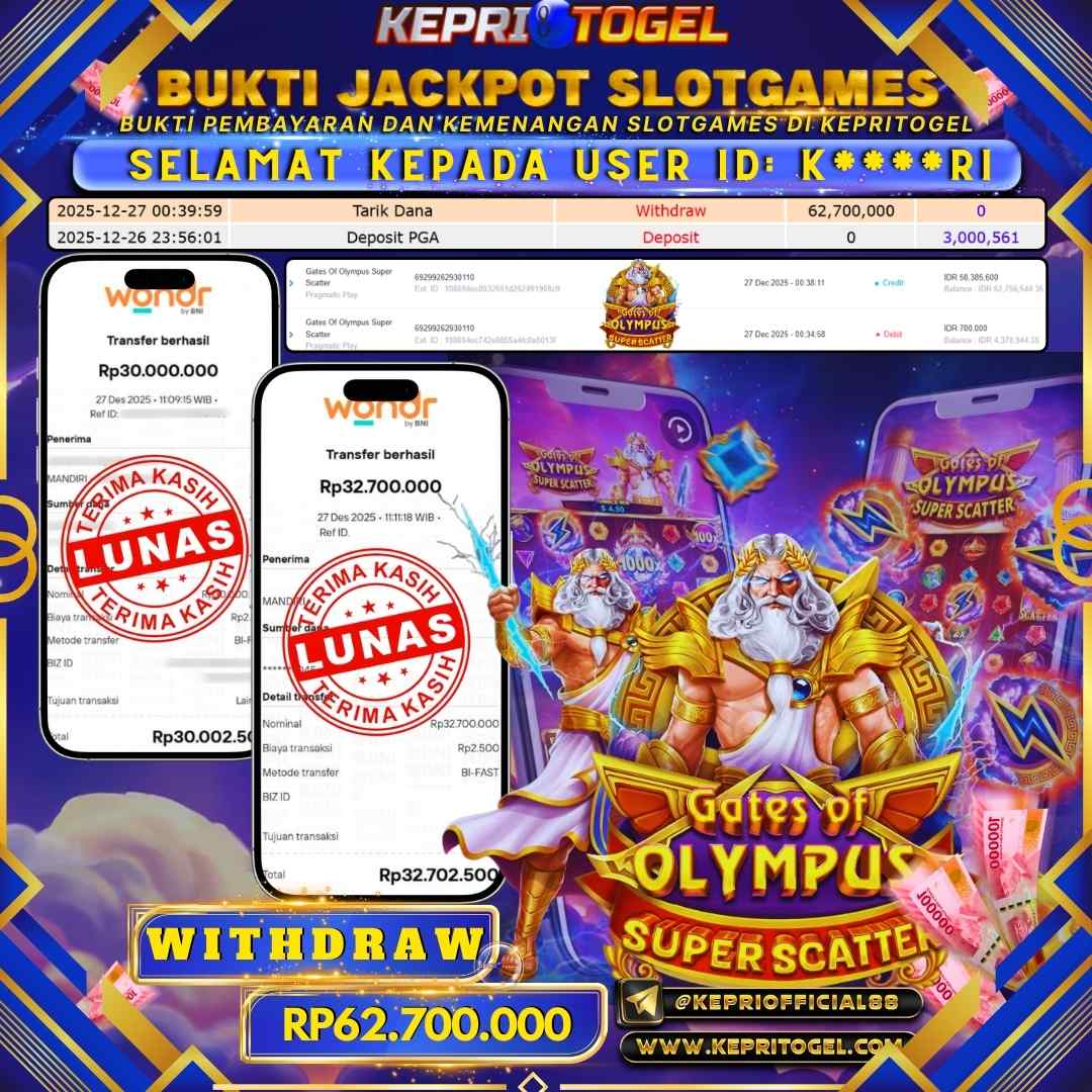 Selamat kepada UserId K****RI telah berhasil mendapatkan kemenangan jackpot pada permainan Slot Gates Of Olympus Super Scatter Kepritogel sebesar Rp62,700,000,- . Kepritogel situs terpercaya sejak dulu hingga saat ini , Untuk kemenangan berapapun pasti akan kami bayarkan . Jangan ragu bermain di Kepri Togel . Kami pihak Kepritogel Menyampaikan terima kasih kepada seluruh member Kepri Togel yang telah Percaya dan setia Bersama kami bermain di Kepritogel hingga saat ini.