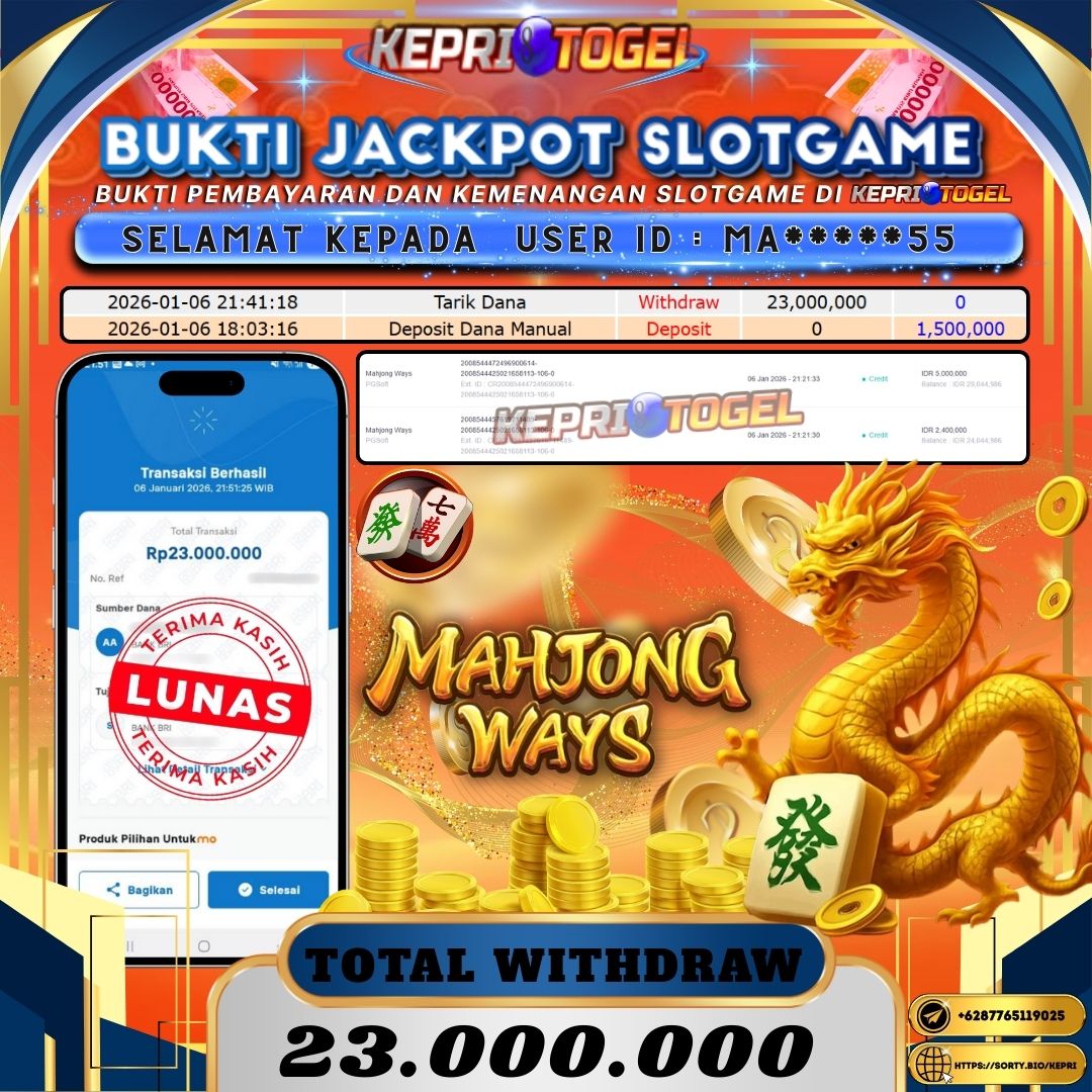 Selamat kepada UserId MA*****55 telah berhasil mendapatkan kemenangan jackpot pada permainan Slot Mahjong Ways Kepritogel sebesar Rp23,000,000,- . Kepritogel situs terpercaya sejak dulu hingga saat ini , Untuk kemenangan berapapun pasti akan kami bayarkan . Jangan ragu bermain di Kepri Togel . Kami pihak Kepritogel Menyampaikan terima kasih kepada seluruh member Kepri Togel yang telah Percaya dan setia Bersama kami bermain di Kepritogel hingga saat ini