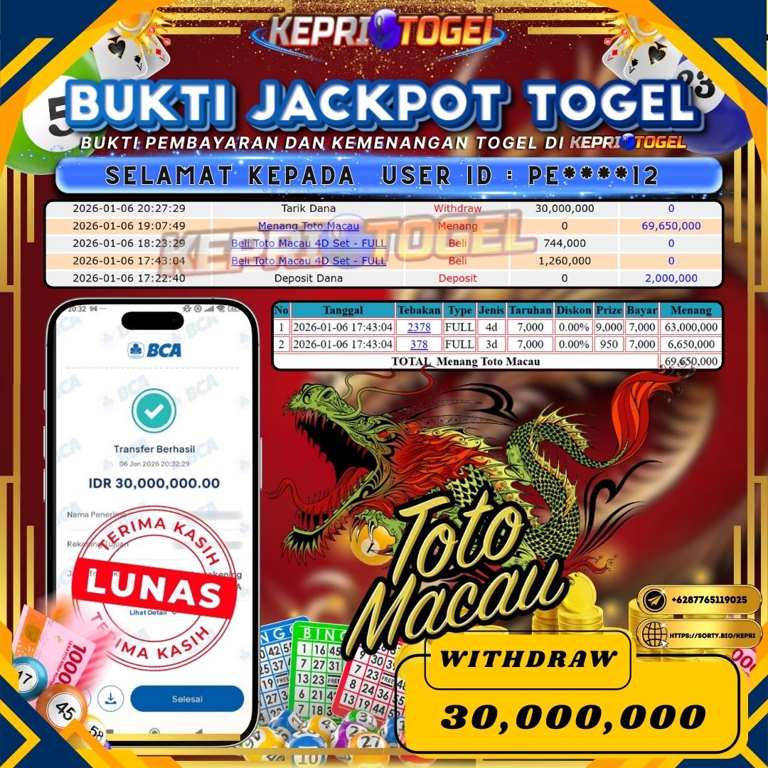 Selamat kepada UserId PE****12 telah berhasil mendapatkan kemenangan jackpot pada Togel Toto Macau 4D Kepritogel sebesar Rp30,000,000,- . Kepritogel situs terpercaya sejak dulu hingga saat ini , Untuk kemenangan berapapun pasti akan kami bayarkan . Jangan ragu bermain di Kepri Togel . Kami pihak Kepritogel Menyampaikan terima kasih kepada seluruh member Kepri Togel yang telah Percaya dan setia Bersama kami bermain di Kepritogel hingga saat ini