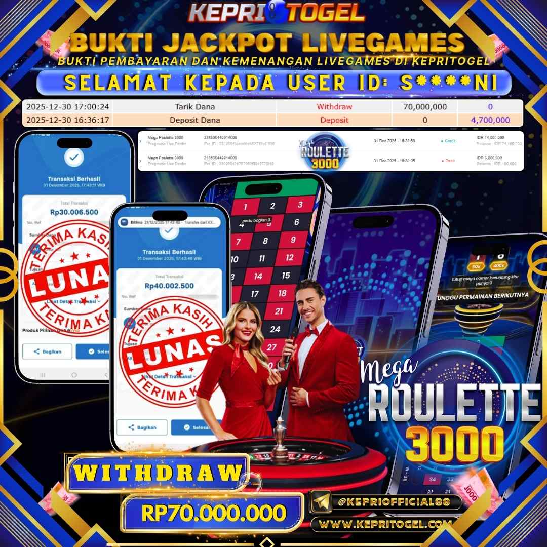 Selamat kepada UserId S****NI telah berhasil mendapatkan kemenangan jackpot pada permainan Live Game Mega Roulette 3000 Kepritogel sebesar Rp70,000,000,- . Kepritogel situs terpercaya sejak dulu hingga saat ini , Untuk kemenangan berapapun pasti akan kami bayarkan . Jangan ragu bermain di Kepri Togel . Kami pihak Kepritogel Menyampaikan terima kasih kepada seluruh member Kepri Togel yang telah Percaya dan setia Bersama kami bermain di Kepritogel hingga saat ini.