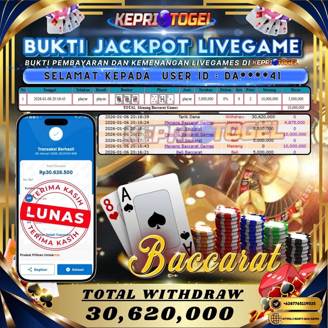 Selamat kepada UserId DA****41 telah berhasil mendapatkan kemenangan jackpot pada permainan Live Game BACCARAT Kepritogel sebesar Rp30,620,000,- . Kepritogel situs terpercaya sejak dulu hingga saat ini , Untuk kemenangan berapapun pasti akan kami bayarkan . Jangan ragu bermain di Kepri Togel . Kami pihak Kepritogel Menyampaikan terima kasih kepada seluruh member Kepri Togel yang telah Percaya dan setia Bersama kami bermain di Kepritogel hingga saat ini