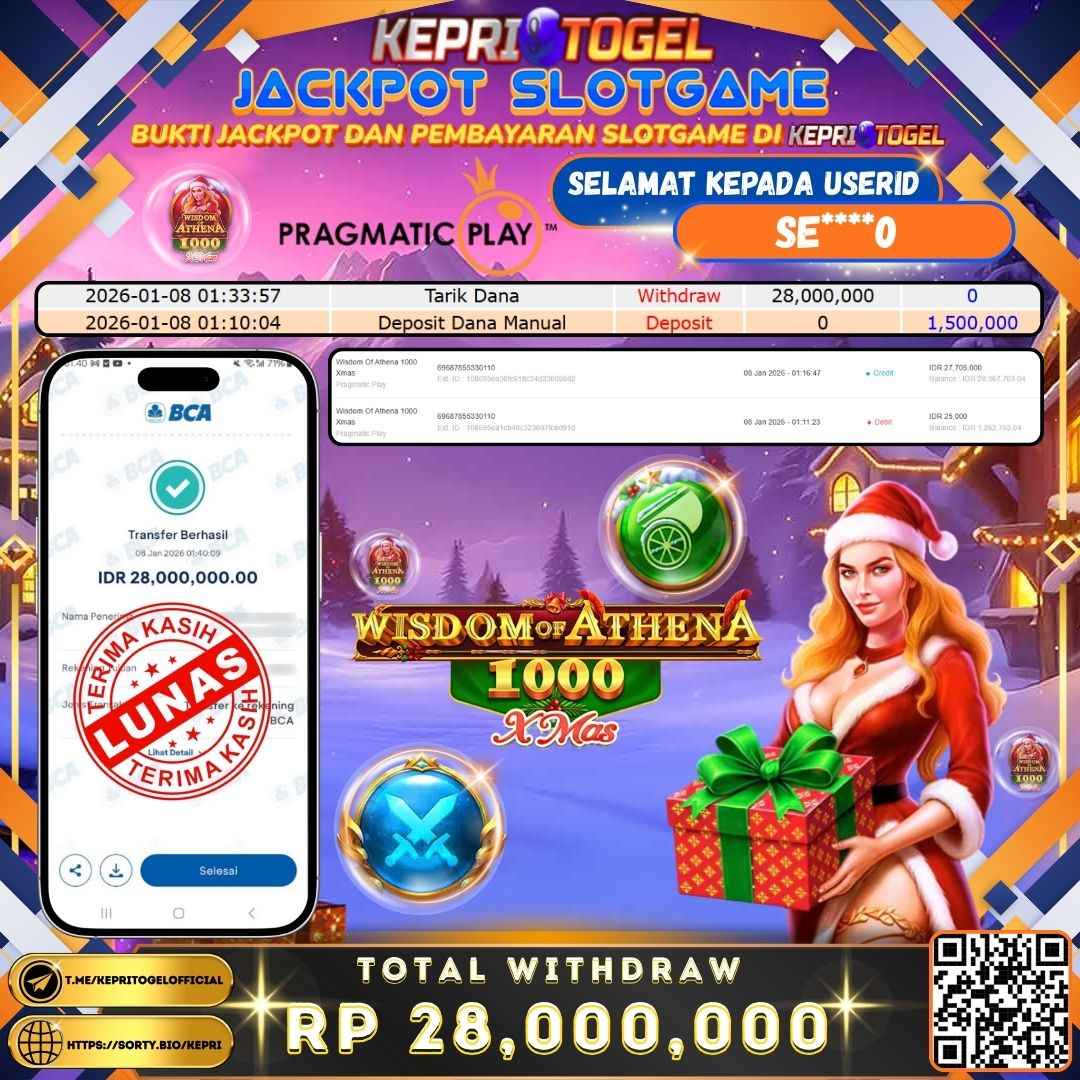 Selamat kepada UserId SE****0 telah berhasil mendapatkan kemenangan jackpot pada Slot Wisdom Of Athena 1000 Xmas Kepritogel sebesar Rp28,000,000,- . Kepritogel situs terpercaya sejak dulu hingga saat ini , Untuk kemenangan berapapun pasti akan kami bayarkan . Jangan ragu bermain di Kepri Togel . Kami pihak Kepritogel Menyampaikan terima kasih kepada seluruh member Kepri Togel yang telah Percaya dan setia Bersama kami bermain di Kepritogel hingga saat ini.