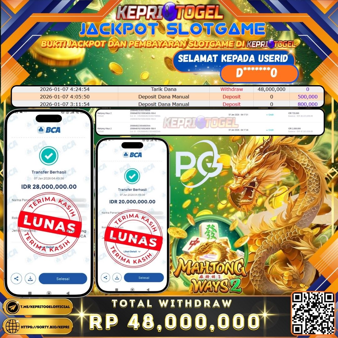 Selamat kepada UserId D*******0 telah berhasil mendapatkan kemenangan jackpot pada permainan Mahjong Ways 2 Kepritogel sebesar Rp48,000,000,- . Kepritogel situs terpercaya sejak dulu hingga saat ini , Untuk kemenangan berapapun pasti akan kami bayarkan . Jangan ragu bermain di Kepri Togel . Kami pihak Kepritogel Menyampaikan terima kasih kepada seluruh member Kepri Togel yang telah Percaya dan setia Bersama kami bermain di Kepritogel hingga saat ini.