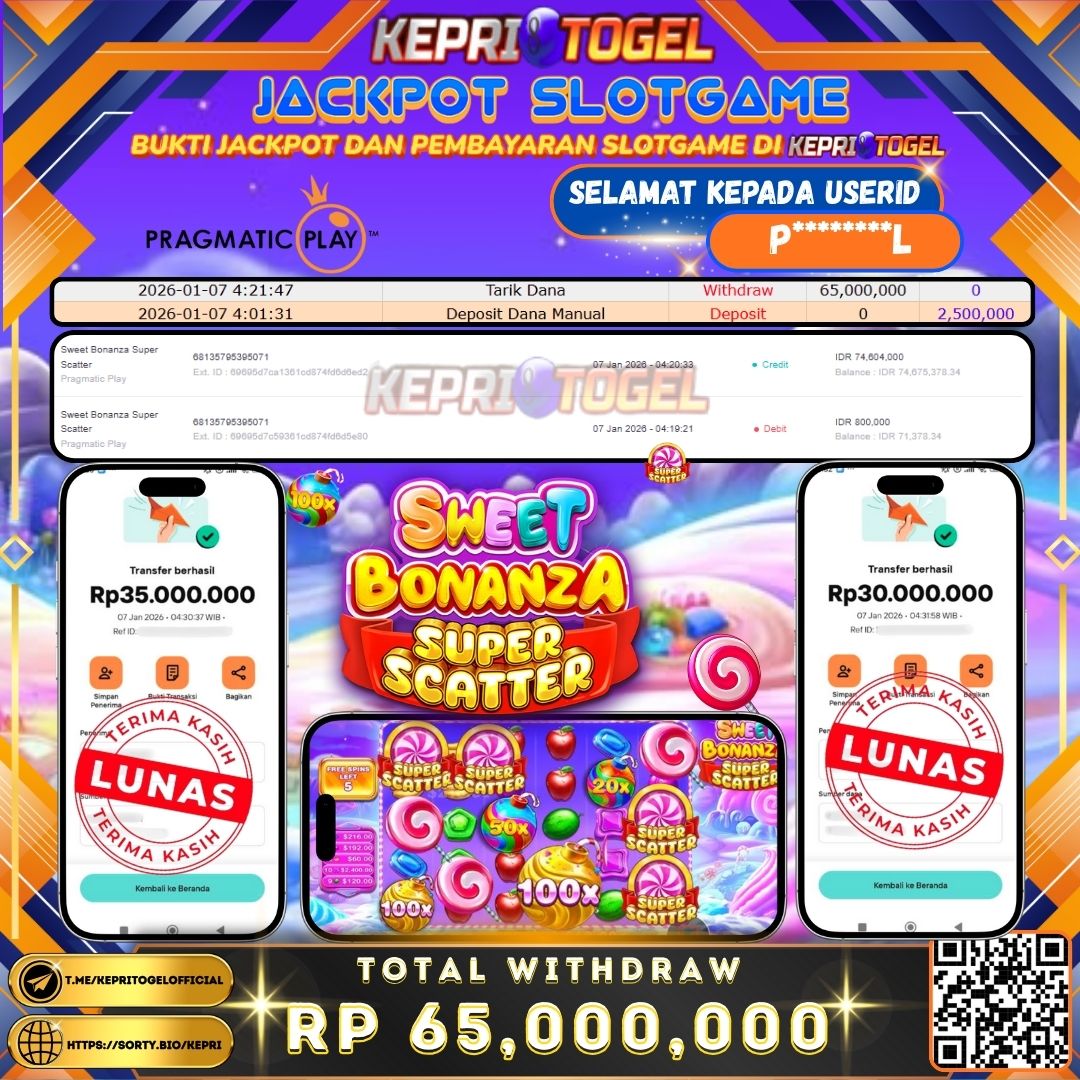 Selamat kepada UserId P********L telah berhasil mendapatkan kemenangan jackpot pada Slot Sweet Bonanza Super Scatter Kepritogel sebesar Rp65,000,000,- . Kepritogel situs terpercaya sejak dulu hingga saat ini , Untuk kemenangan berapapun pasti akan kami bayarkan . Jangan ragu bermain di Kepri Togel . Kami pihak Kepritogel Menyampaikan terima kasih kepada seluruh member Kepri Togel yang telah Percaya dan setia Bersama kami bermain di Kepritogel hingga saat ini.