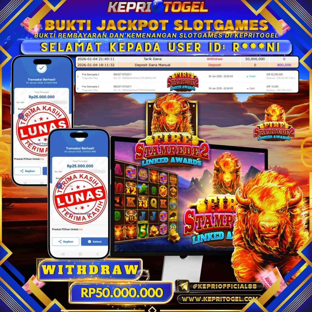 Selamat kepada UserId R***NI telah berhasil mendapatkan kemenangan jackpot pada permainan Slot Fire Stampede 2 Kepritogel sebesar Rp50,000,000,- . Kepritogel situs terpercaya sejak dulu hingga saat ini , Untuk kemenangan berapapun pasti akan kami bayarkan . Jangan ragu bermain di Kepri Togel . Kami pihak Kepritogel Menyampaikan terima kasih kepada seluruh member Kepri Togel yang telah Percaya dan setia Bersama kami bermain di Kepritogel hingga saat ini.