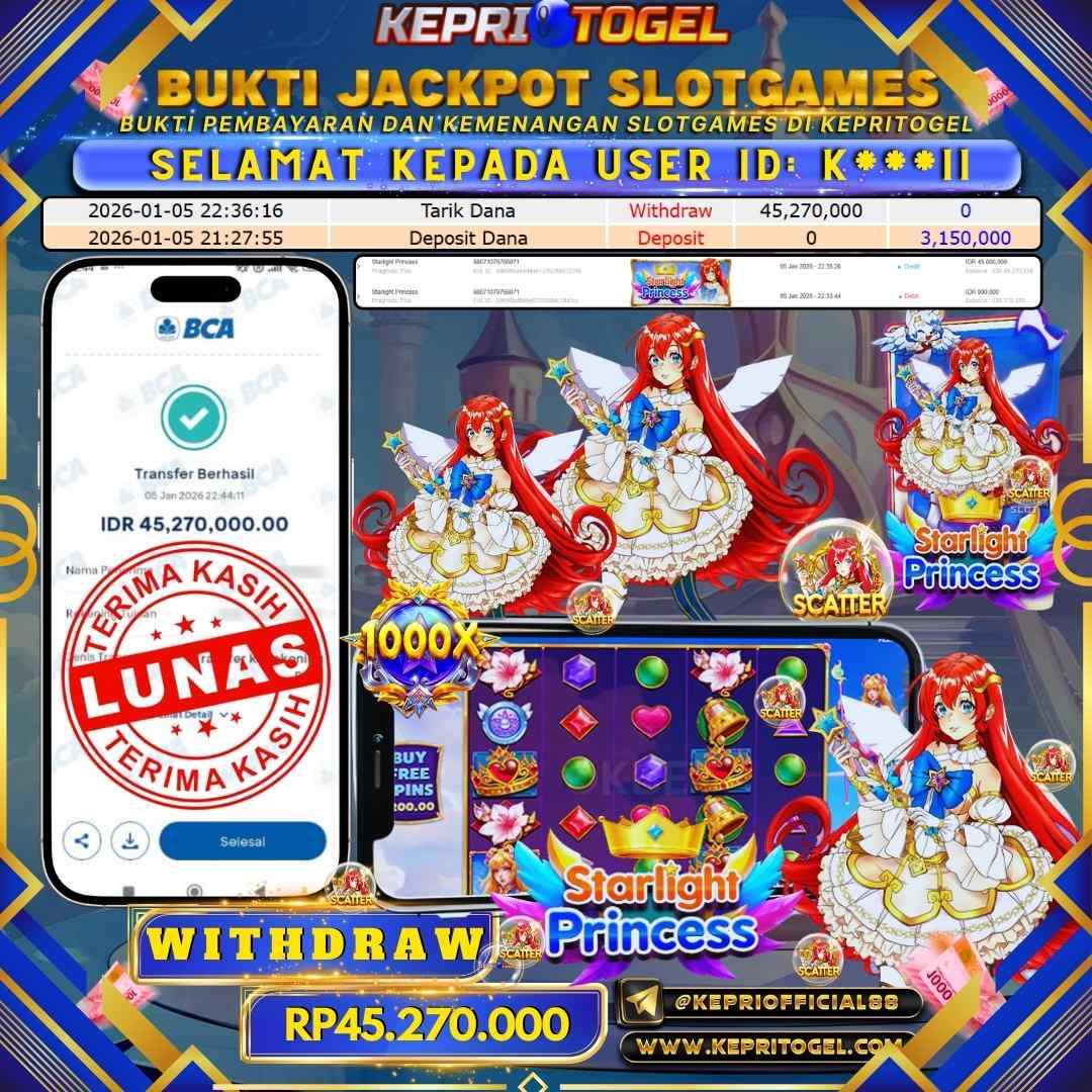 Selamat kepada UserId K***II telah berhasil mendapatkan kemenangan jackpot pada permainan Slot Starlight Princess Kepritogel sebesar Rp45,270,000,- . Kepritogel situs terpercaya sejak dulu hingga saat ini , Untuk kemenangan berapapun pasti akan kami bayarkan . Jangan ragu bermain di Kepri Togel . Kami pihak Kepritogel Menyampaikan terima kasih kepada seluruh member Kepri Togel yang telah Percaya dan setia Bersama kami bermain di Kepritogel hingga saat ini.